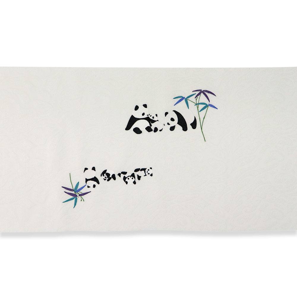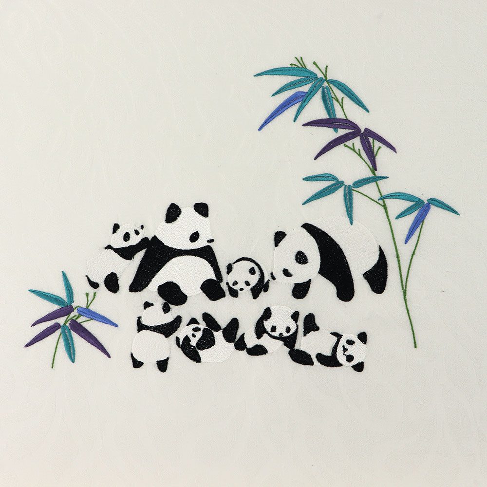 可愛らしいパンダの家族を刺繍した一本。大きくて丸い親パンダやころころと転がる子パンダなど、表情豊かなパンダたちが帯元を温かく彩ってくれます。