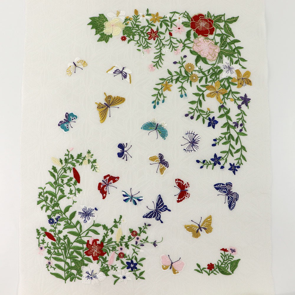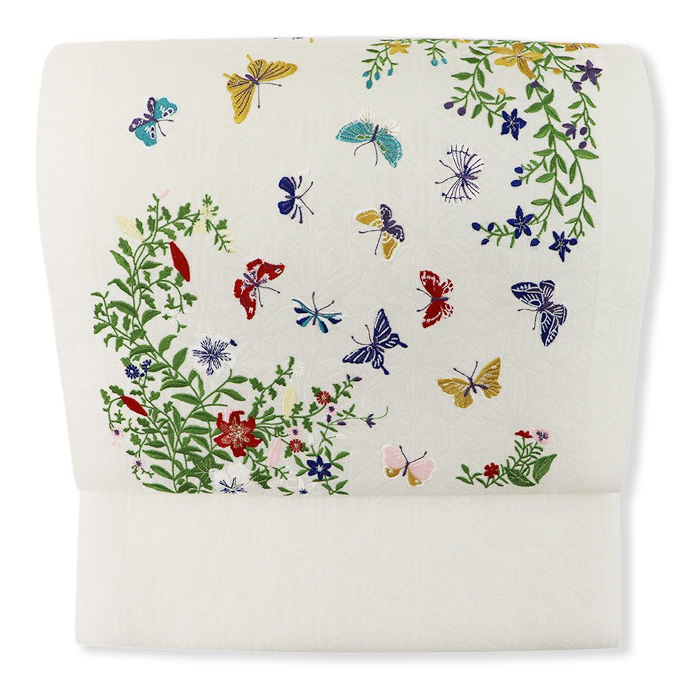 色とりどりの蝶と花を表現した一本。まるで楽園のような華やかな雰囲気を持ちつつ、縦横に伸びる草が縁取りのようになっており、お太鼓や腹前の構図について考え抜かれたデザインであることが伺えます。