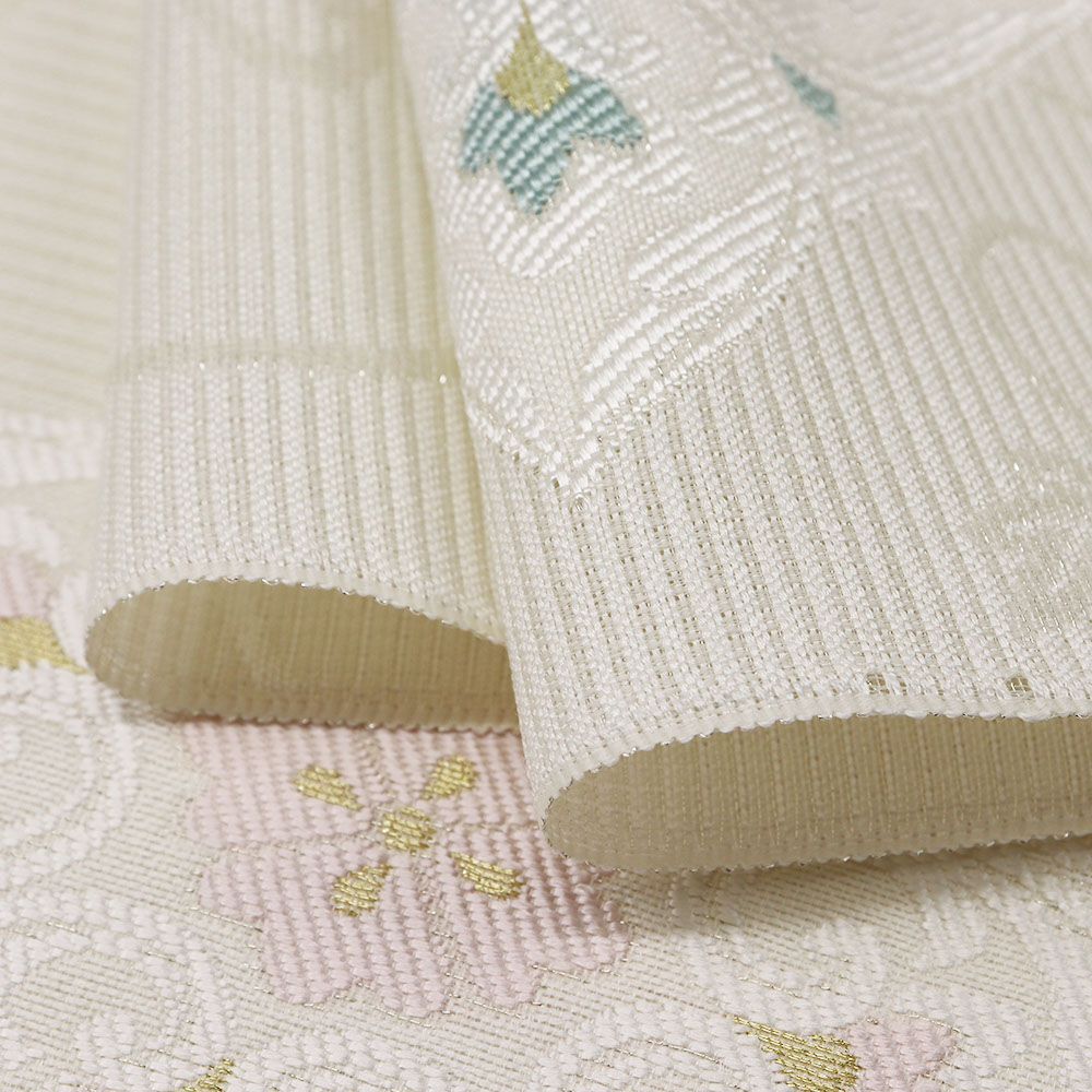 アイボリーの絽地に、金糸や銀糸を交えた花菱が配された一本。淡い色を基調とし、シンプルながら洗練されたデザインとなっており、着物の色や柄を問わず、夏の様々なコーディネートに活躍してくれそうです。