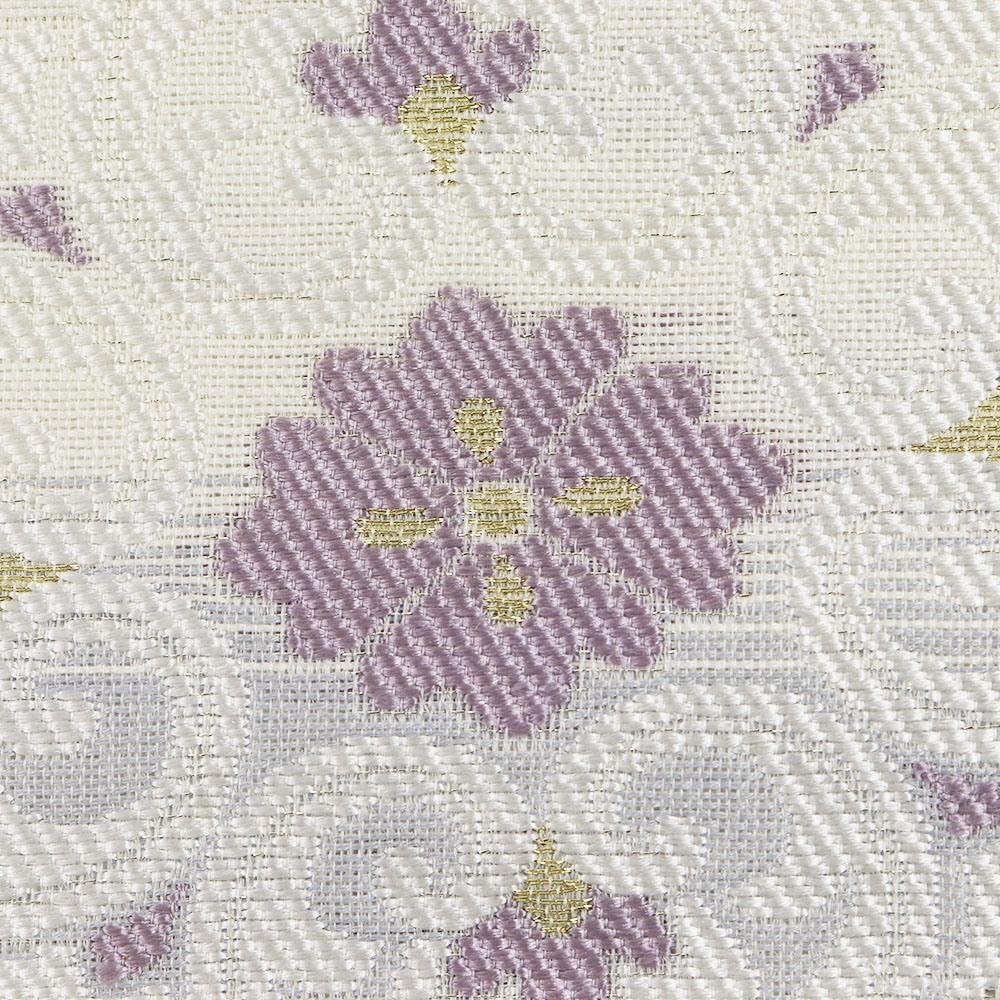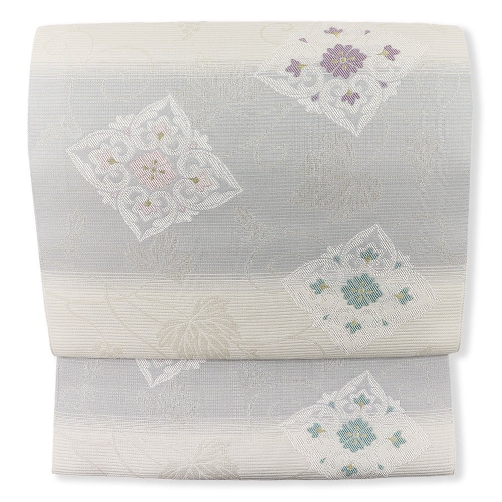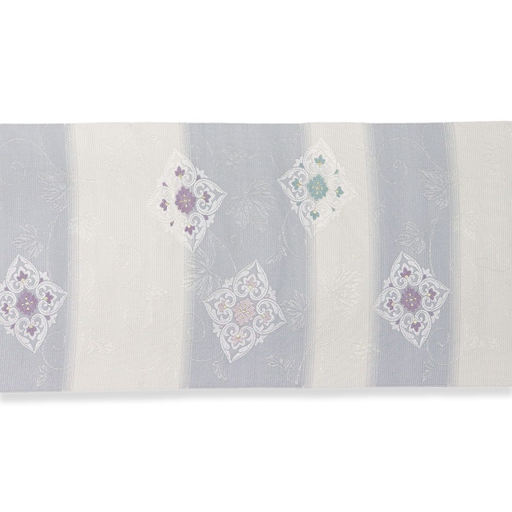 アイボリーと水色の絽地に、金糸や銀糸を交えた花菱が配された一本。淡い色を基調とし、シンプルながら洗練されたデザインとなっており、着物の色や柄を問わず、夏の様々なコーディネートに活躍してくれそうです。