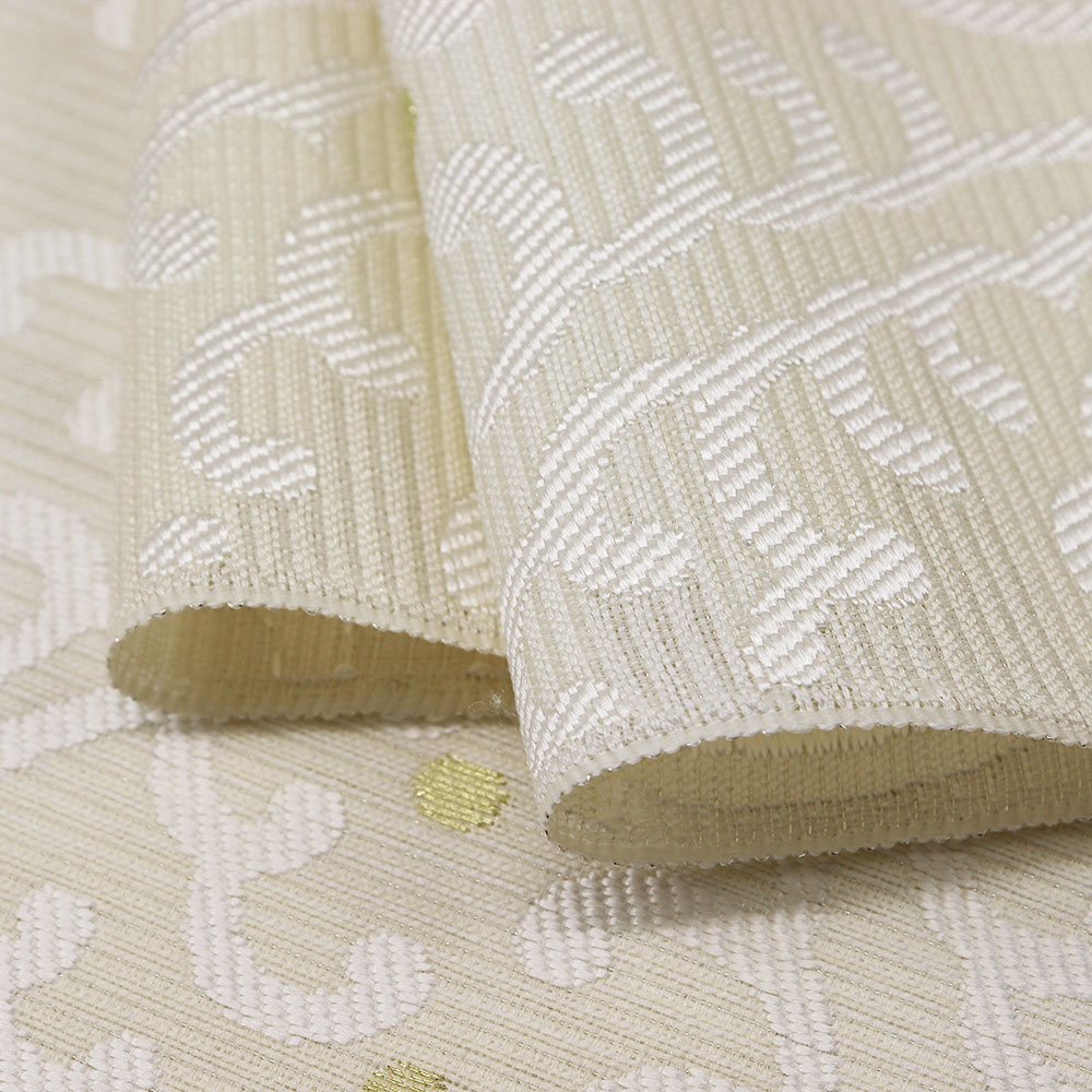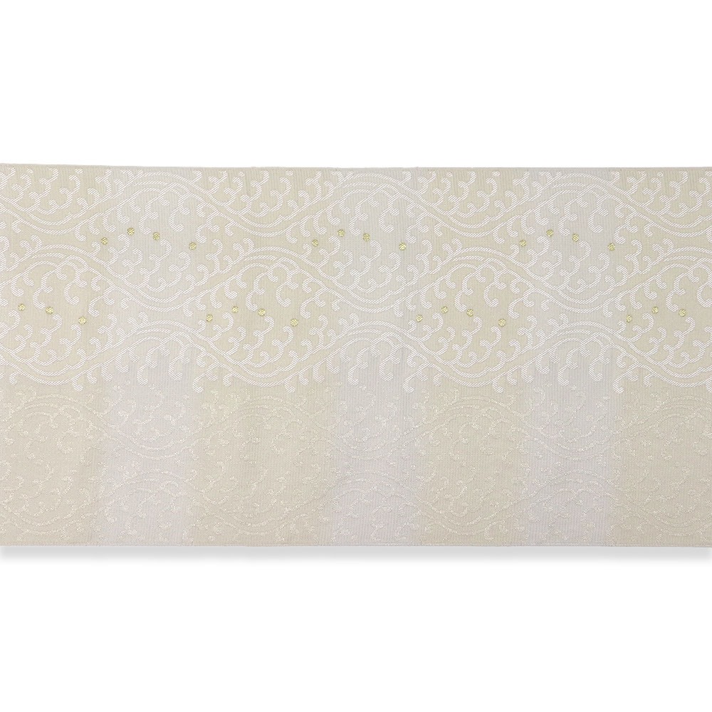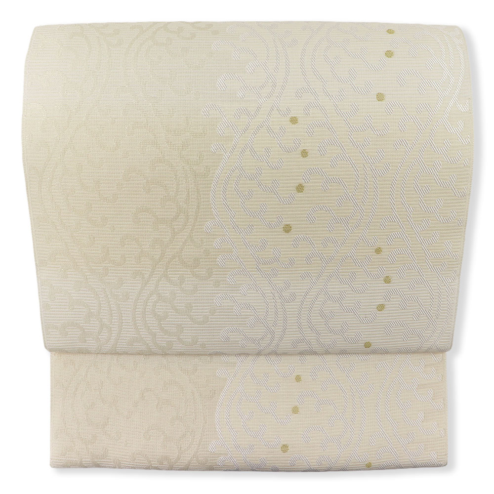 アイボリーの絽地に、金糸や銀糸を交えたアラベスクが配された一本。淡い色を基調とし、シンプルながら洗練されたデザインとなっており、着物の色や柄を問わず、夏の様々なコーディネートに活躍してくれそうです。