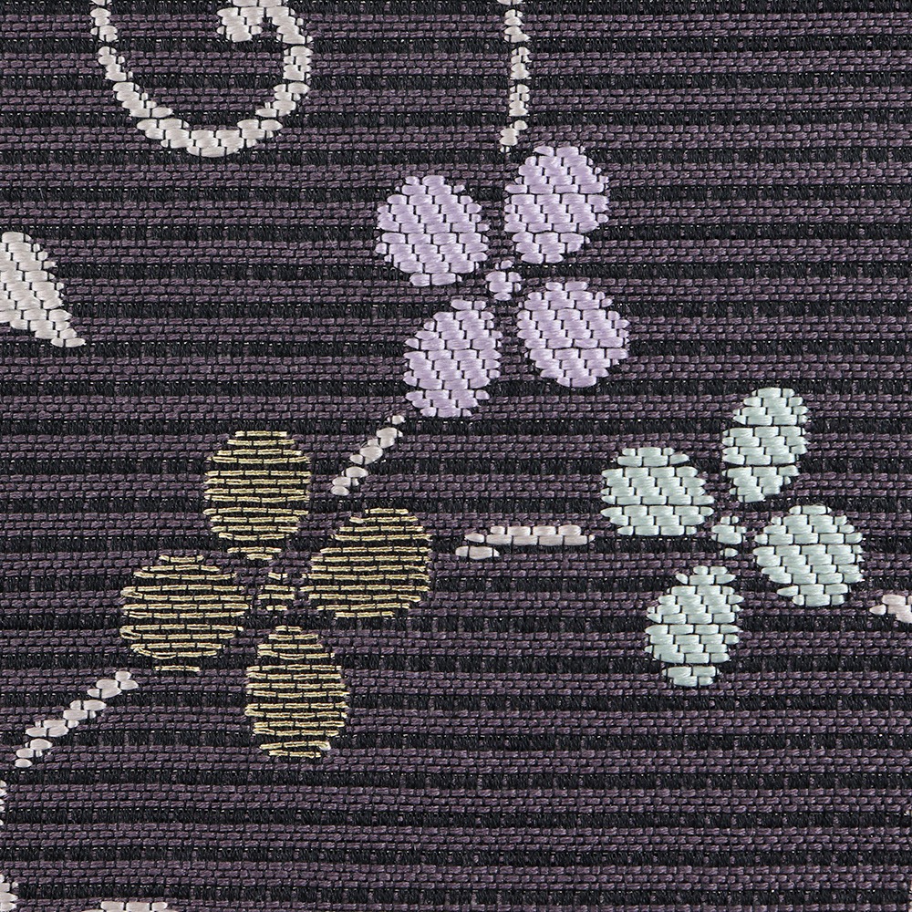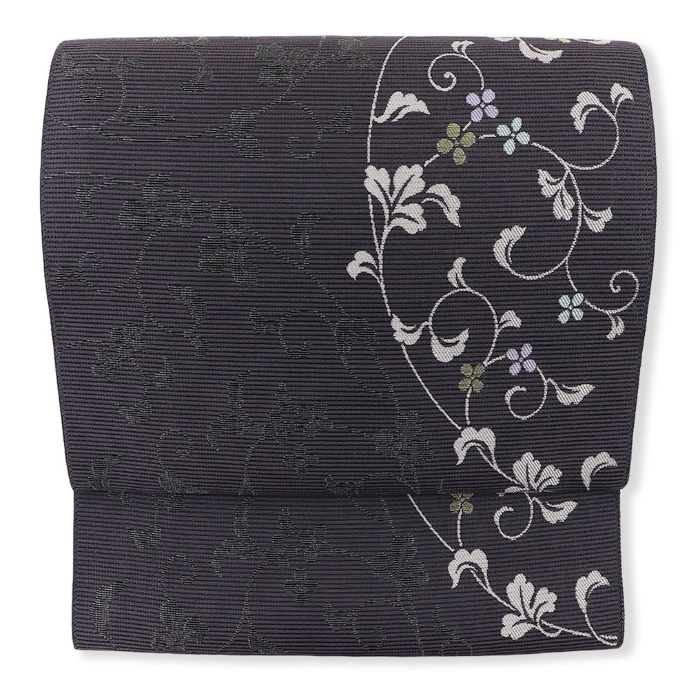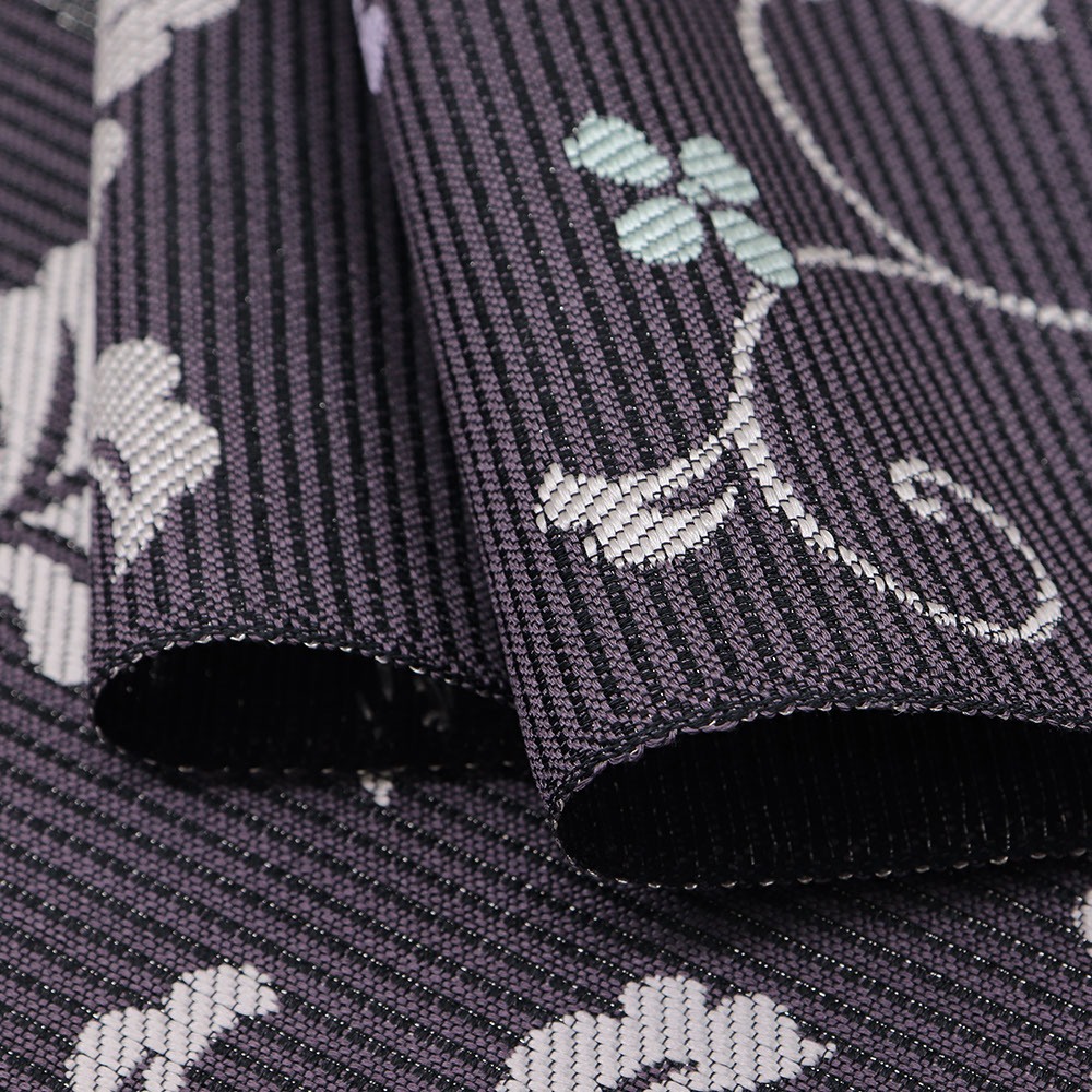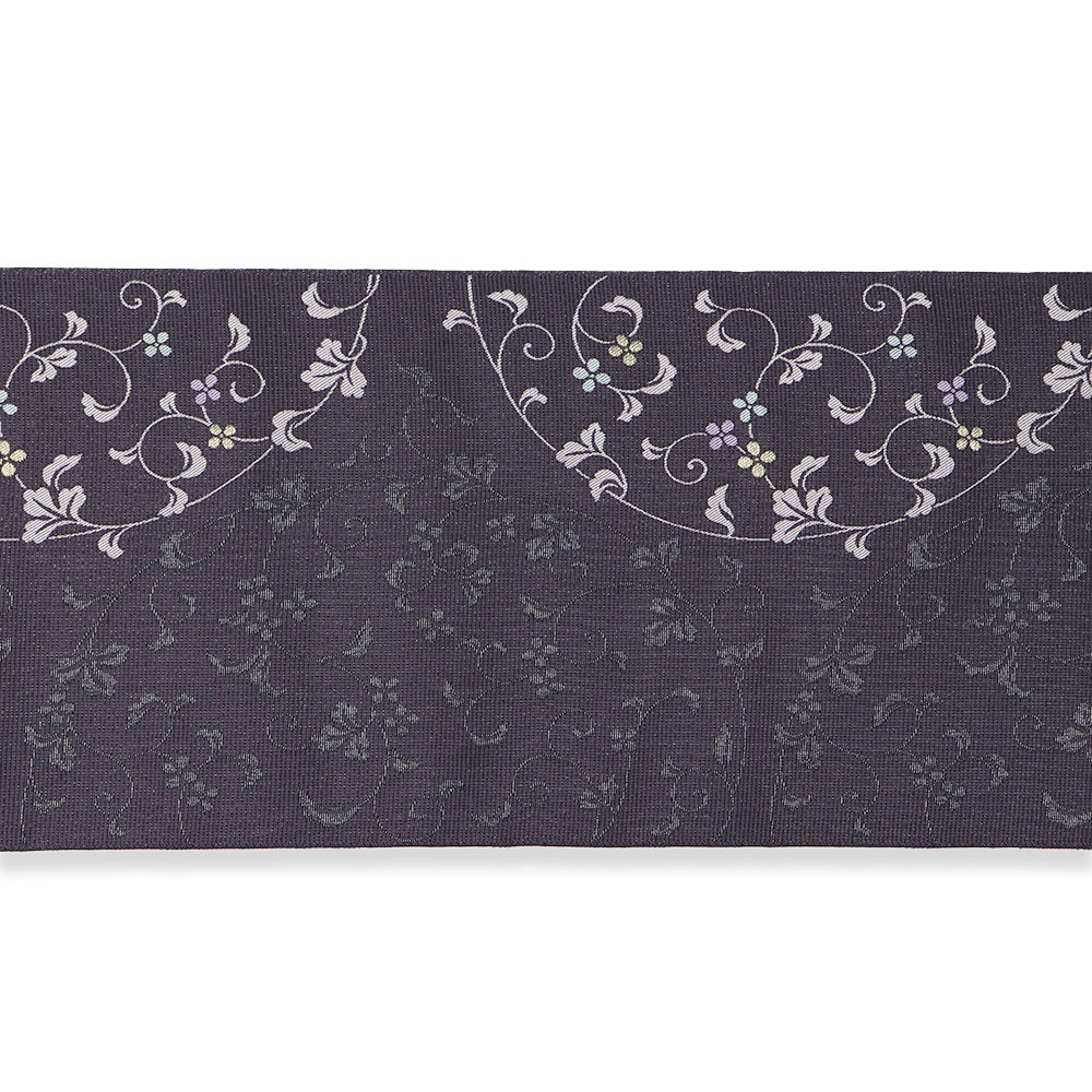 パープルグレーの絽地に、金糸や銀糸を交えた円取花唐草が配された一本。洗練されたデザインと、落ち着いた暗色のカラーリングで、夏の様々なコーディネートに引き締めてくれるでしょう。