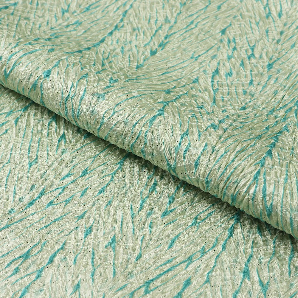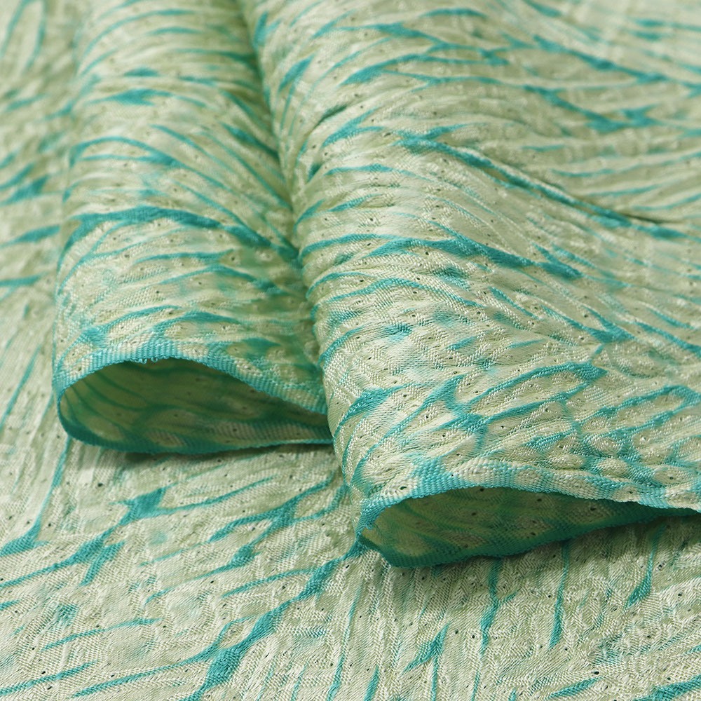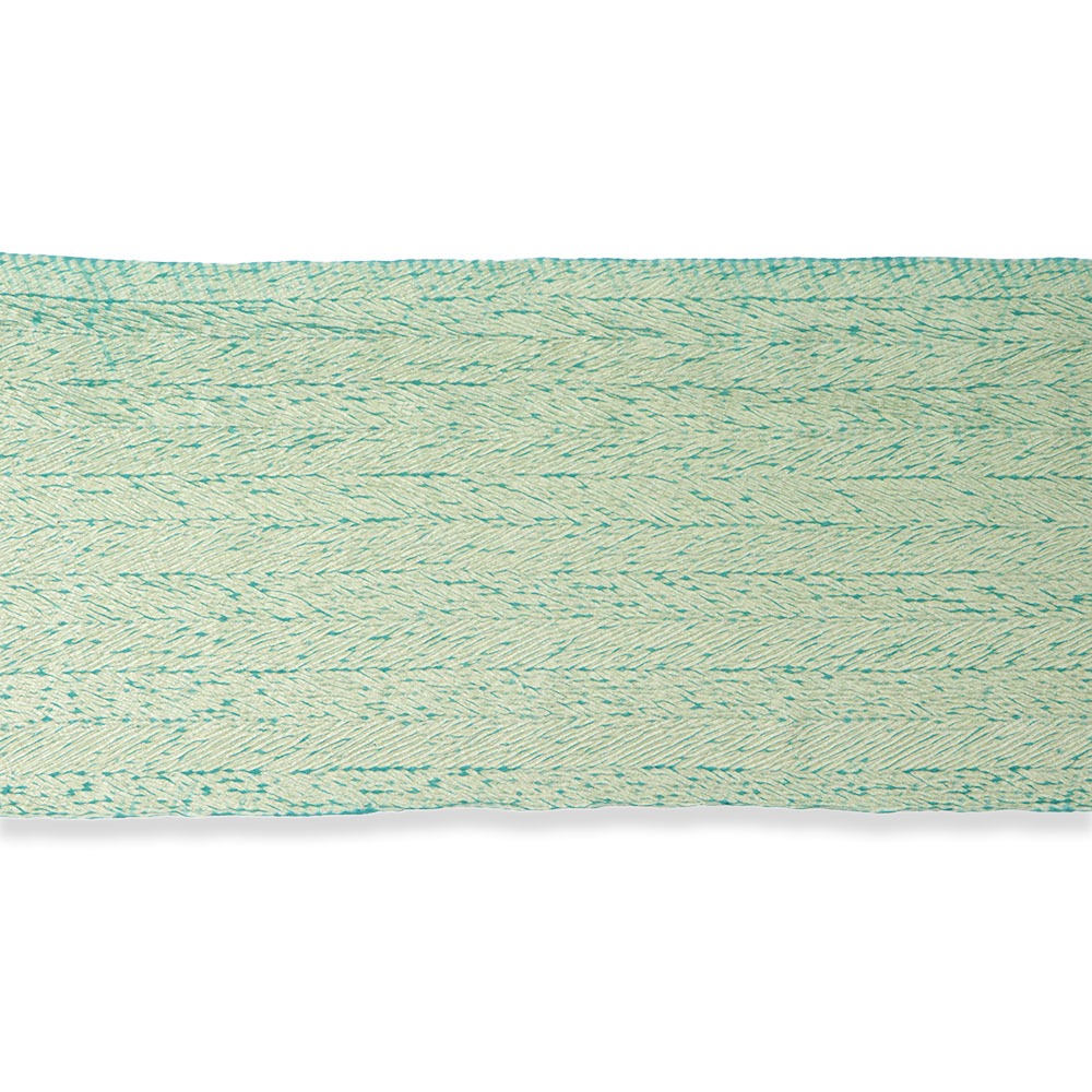 こちらは生地全体に杢目絞りを施した総絞りの一本。直線的な柄行き、薄緑と青緑のコントラストが印象的ながら、絞りによる立体感もあいまって、帯回りをふんわりと包んでくれます。