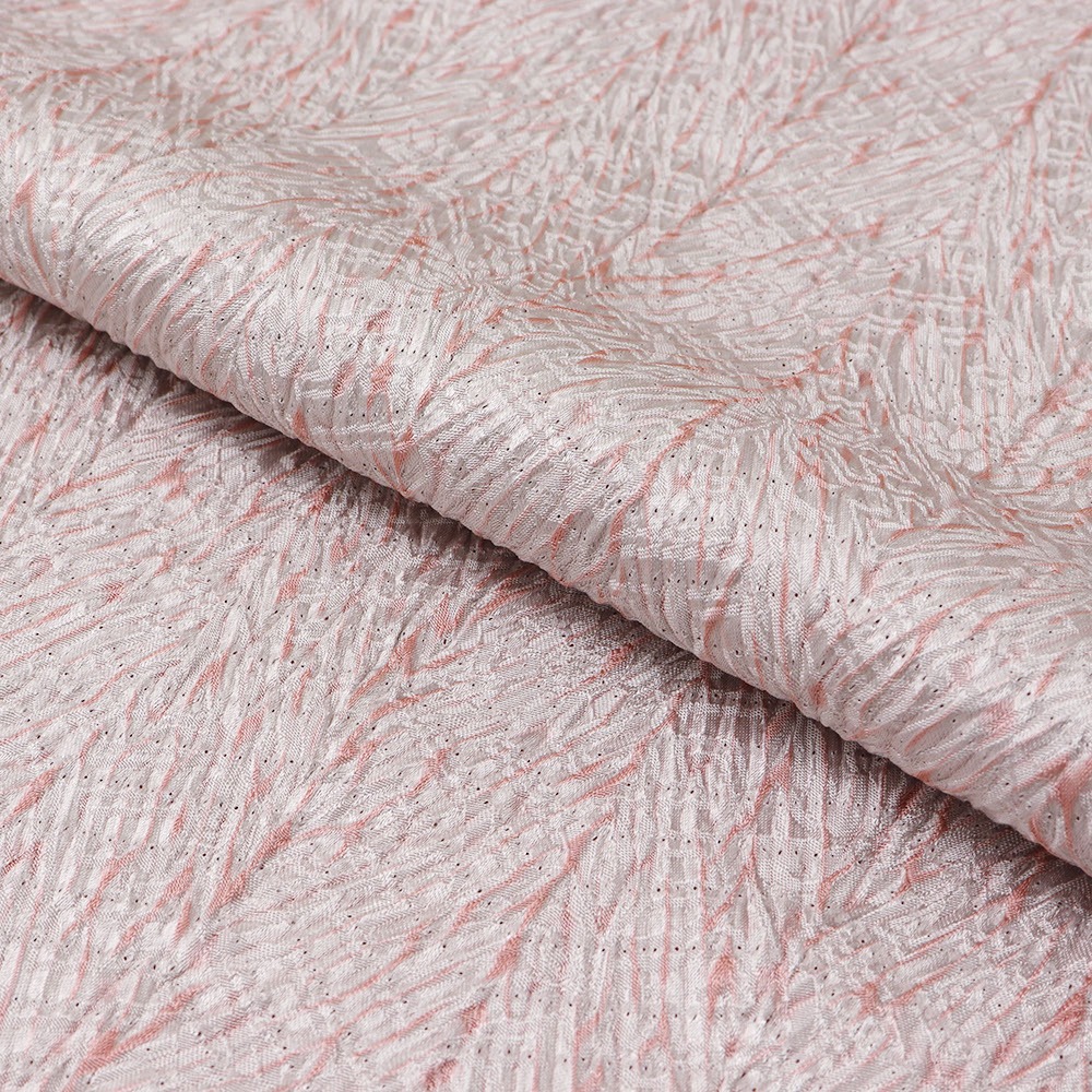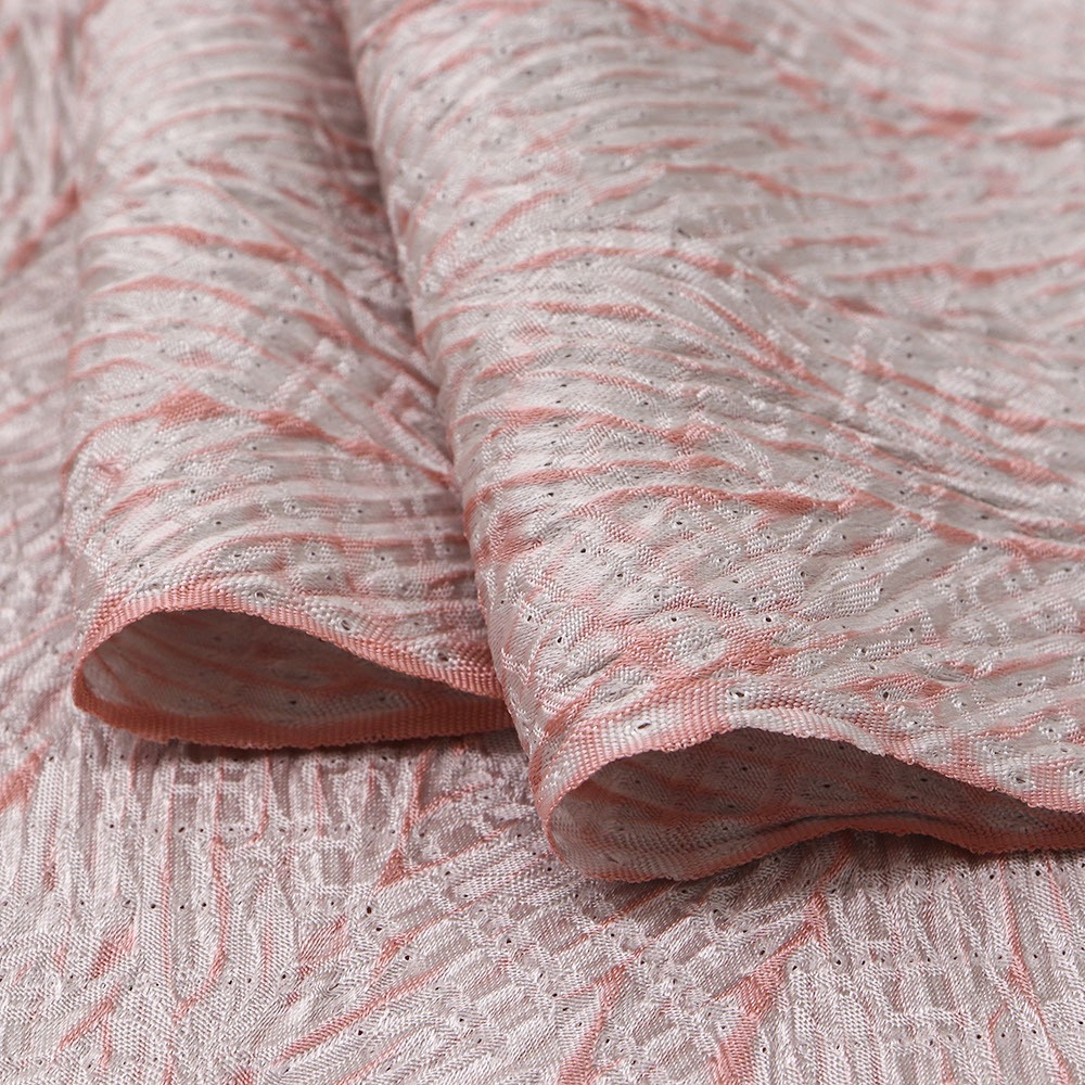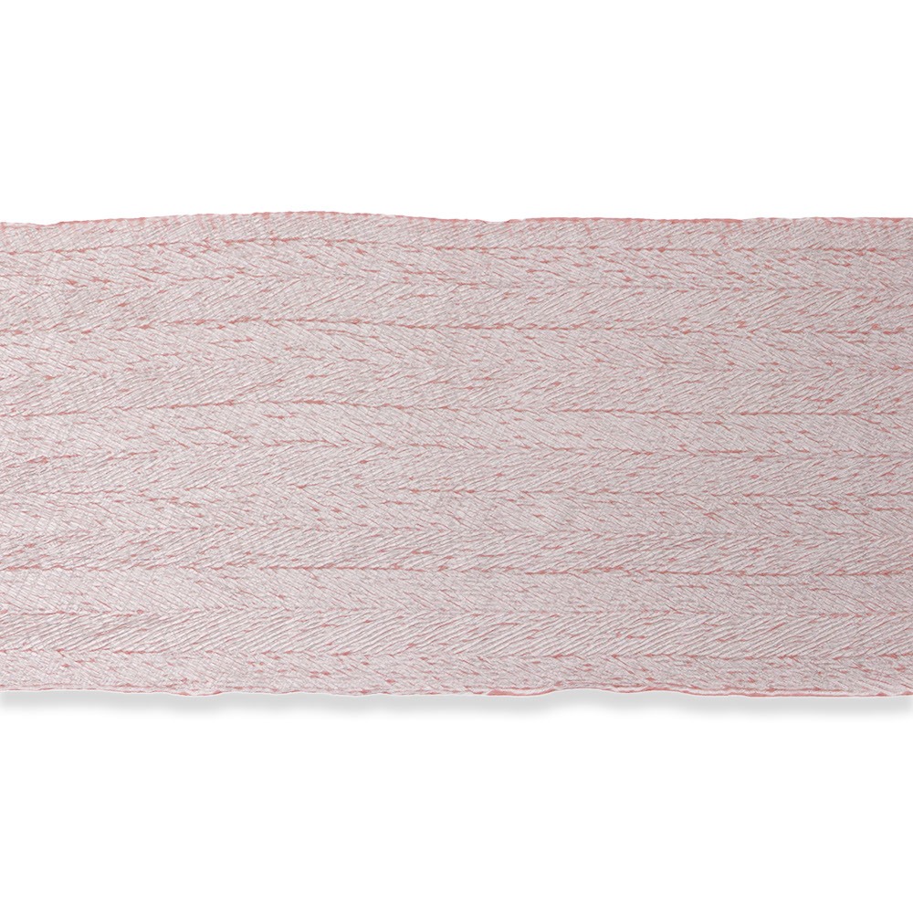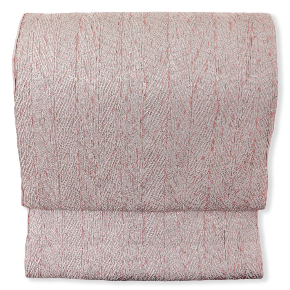 こちらは生地全体に杢目絞りを施した総絞りの一本。直線的な柄行きと、桃色と薄桃色のコントラストが印象的ながら、絞りによる立体感もあいまって、帯回りをふんわりと包んでくれます。