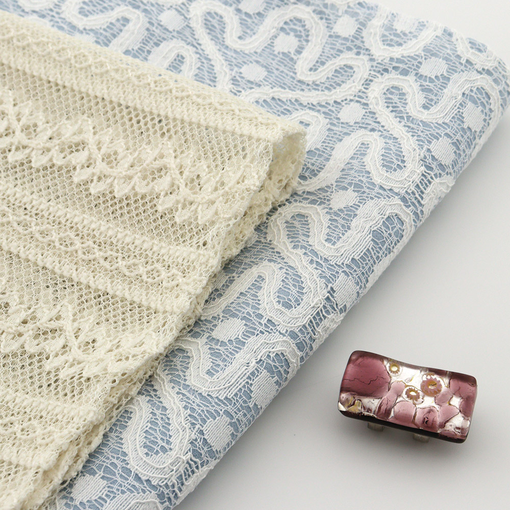 表にはジオメトリー柄のレース生地、裏にはブルーのシフォン生地をチョイスし、ボンディング加工を施した一枚です。