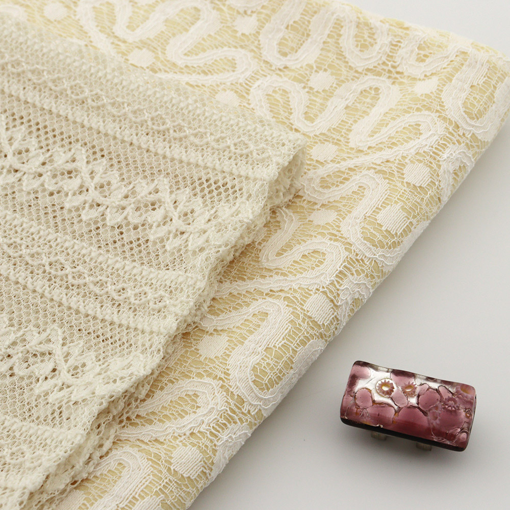 表にはジオメトリー柄のレース生地、裏にはイエローのシフォン生地をチョイスし、ボンディング加工を施した一枚です。