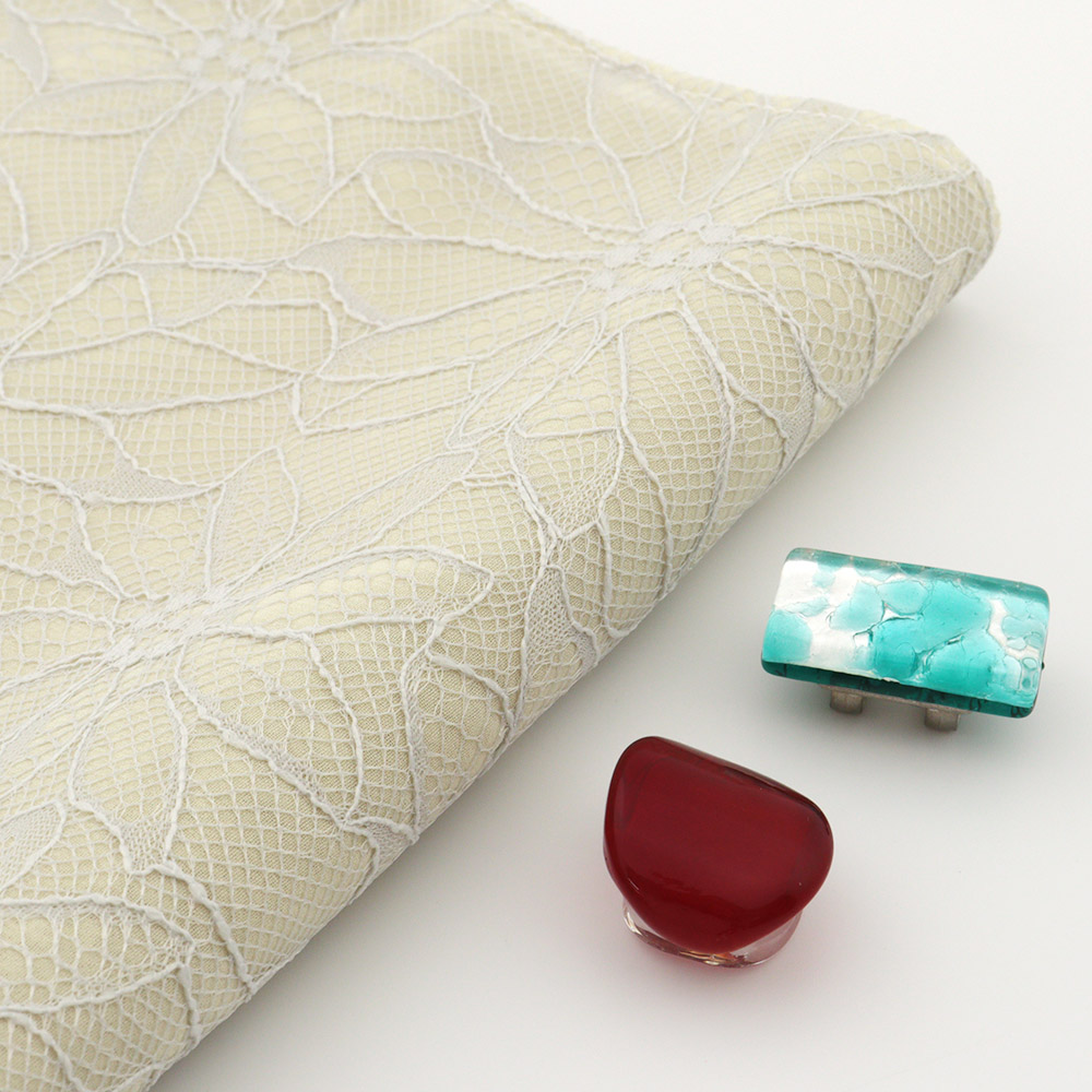 表地のレース生地は繊細な柄行を、裏地として採用したシフォン生地はレースが美しく引き立つ色を選びました。甘すぎない花柄とベージュで落ち着いたエレガントな一枚に。生地の重なりによって変化する透け感にも注目です。