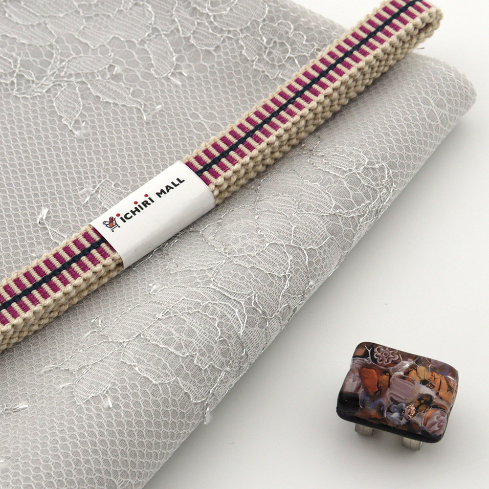 畳目に従って織り出されたはしご柄は、マゼンタを中心に、センターラインに紺色を配したモダンな色使い。真田紐の特徴のひとつである平たい形状は、帯周りに隙間なくピッタリと寄り添うので、帯留や帯飾りを目立たせてくれそうです。