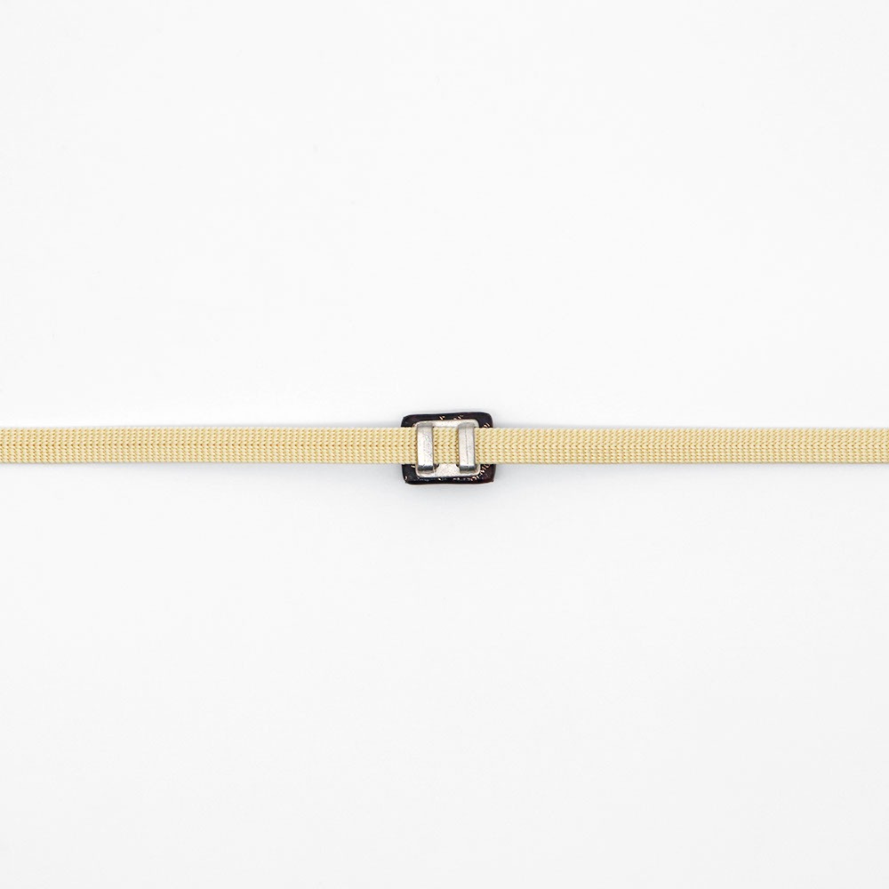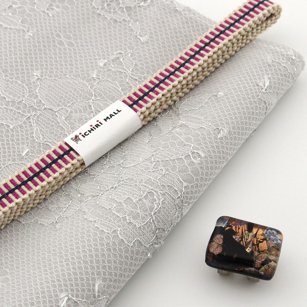 畳目に従って織り出されたはしご柄は、マゼンタを中心に、センターラインに紺色を配したモダンな色使い。真田紐の特徴のひとつである平たい形状は、帯周りに隙間なくピッタリと寄り添うので、帯留や帯飾りを目立たせてくれそうです。