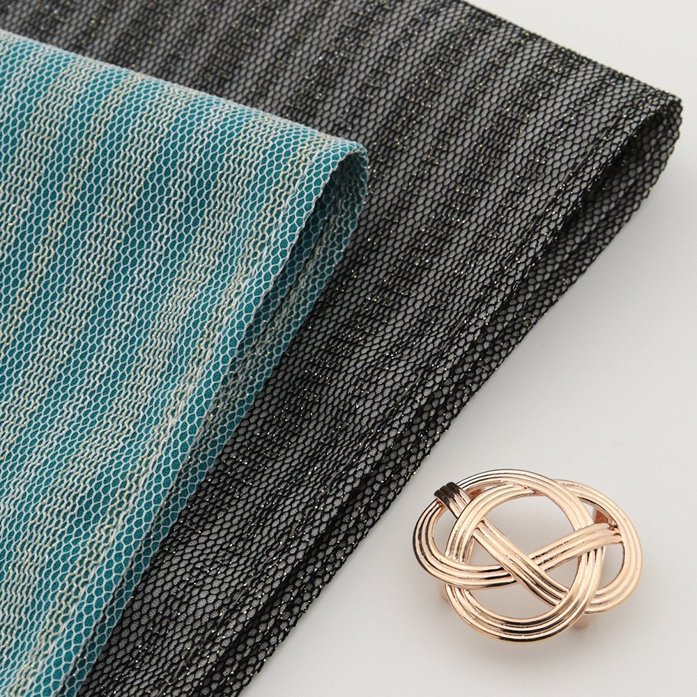 表にはストライプ柄のラメ入りレース生地、裏にはターコイズのシフォン生地をチョイスし、ボンディング加工を施した一枚です。