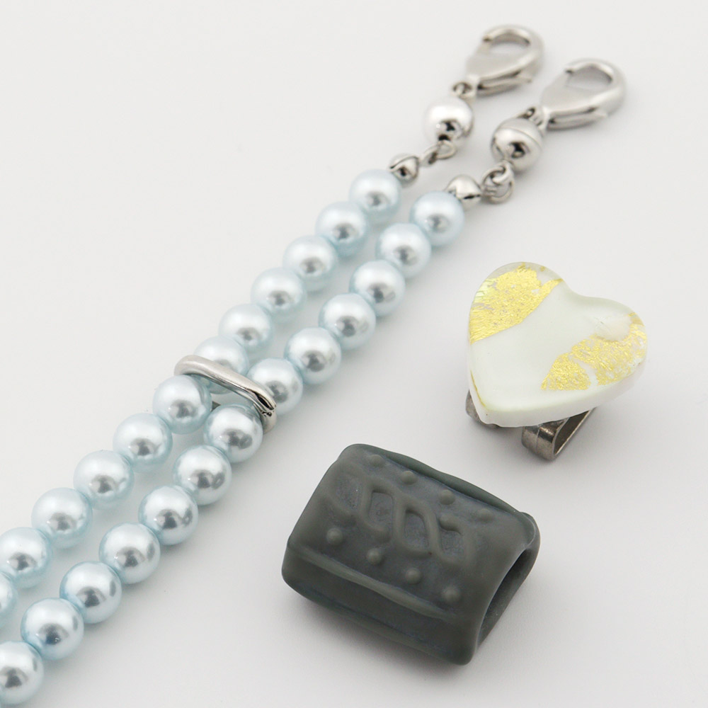 紐部分に樹脂パールを連ね、中心で束ねたネックレスのようなデザイン。豊かな色彩表現が魅力の樹脂パールで、よりカジュアルスタイルに合わせやすくなっています。