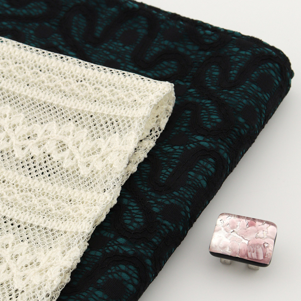 表にはジオメトリー柄のレース生地、裏にはグリーンのシフォン生地をチョイスし、ボンディング加工を施した一枚です。