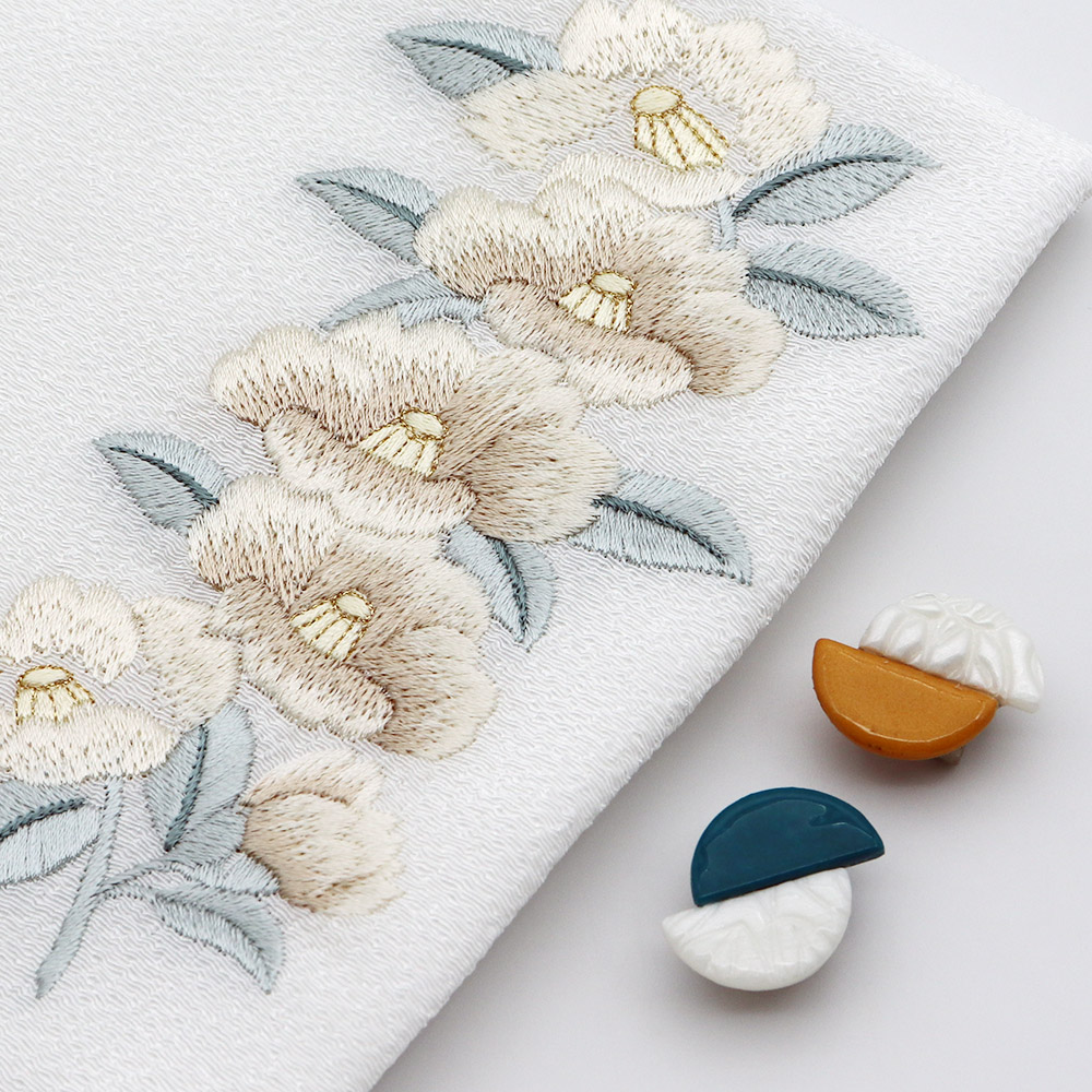 淡い色目の椿模様が美しい刺繍半衿。