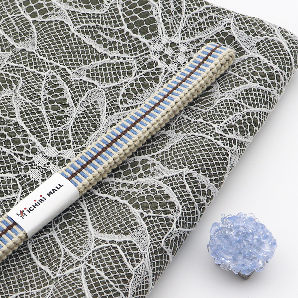 畳目に従って織り出されたはしご柄は、空色を中心に、センターラインに茶色を配したモダンな色使い。真田紐の特徴のひとつである平たい形状は、帯周りに隙間なくピッタリと寄り添うので、帯留や帯飾りを目立たせてくれそうです。