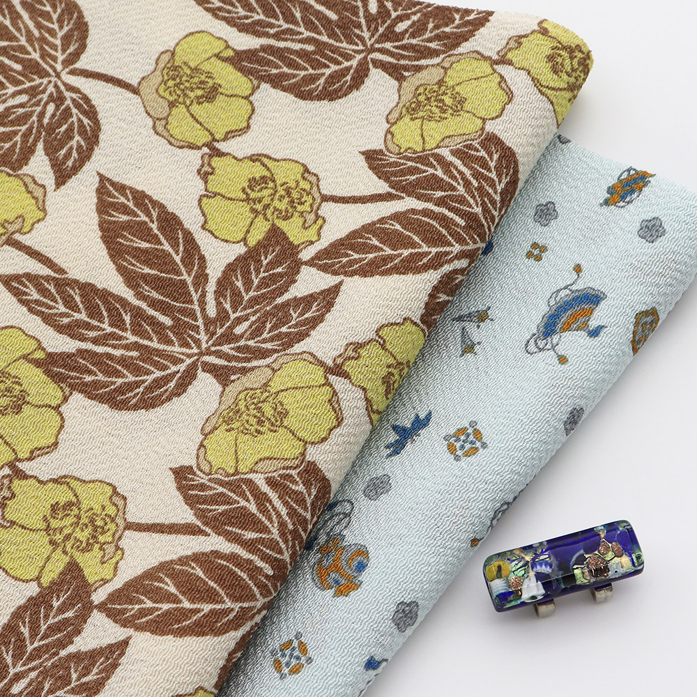 帯回りの印象をがらりと変えることのできる「柄物」に特化し、一層お洒落を楽しんでいただける配色にこだわった逸品に仕上げました。生地は絹ならではのしっとりとした手触り、無数の小さな凸凹が特徴で、撚りがかかっている八丁撚糸を選びました。いち利モールこだわりの友禅帯揚で、オシャレな帯回りを楽しんでみてはいかがでしょうか。