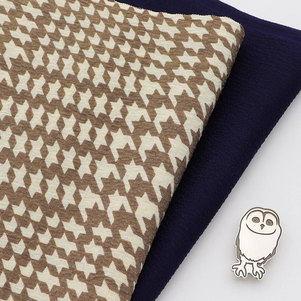 大きなシボが特徴であるうずらちりめん生地に、千鳥柄を配したモダンな帯揚です。大小異なる千鳥柄でチェックを表現した柄行きで、単調になりがちなパターン柄も動きのある逸品に。茶色とクリームの落ち着いた色合いは大胆な柄行きに負けることなく、帯回りをスッキリとまとめあげてくれます。