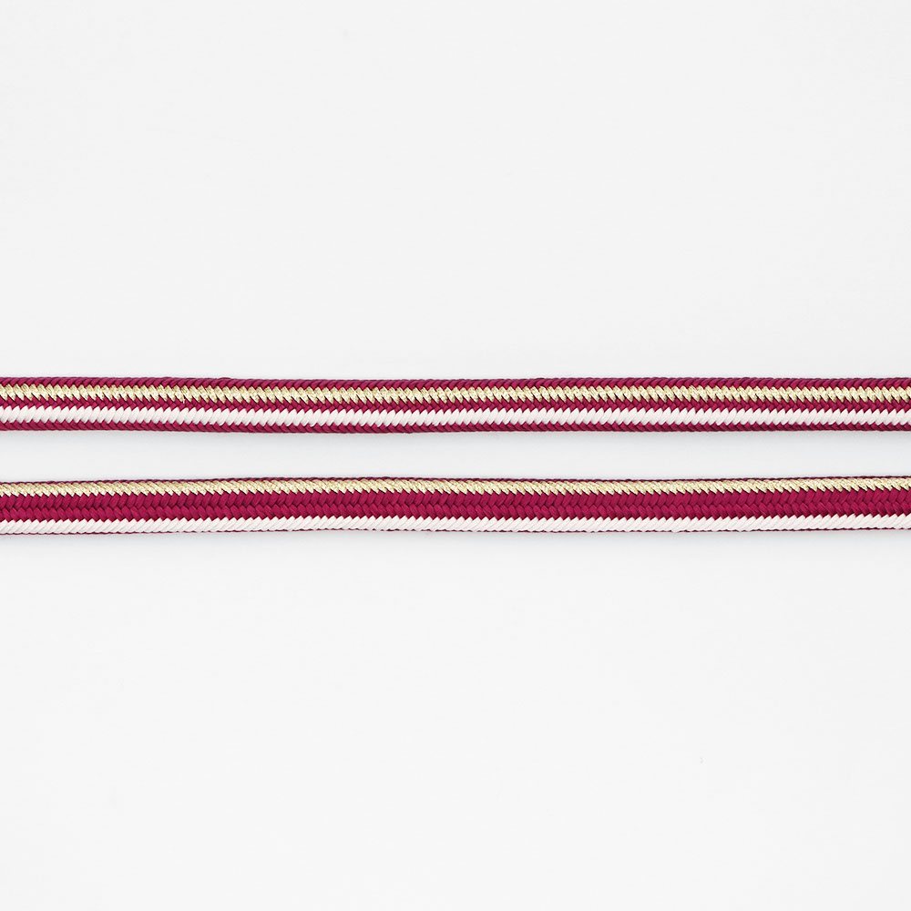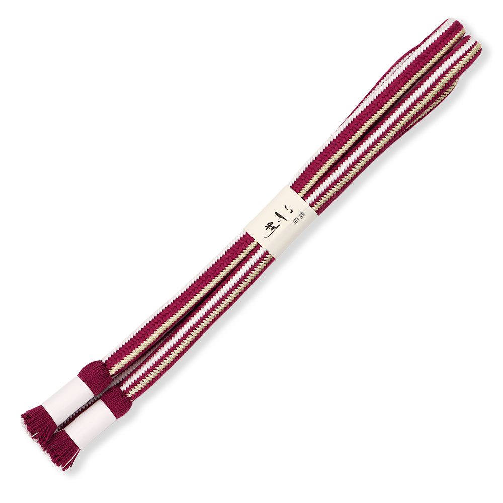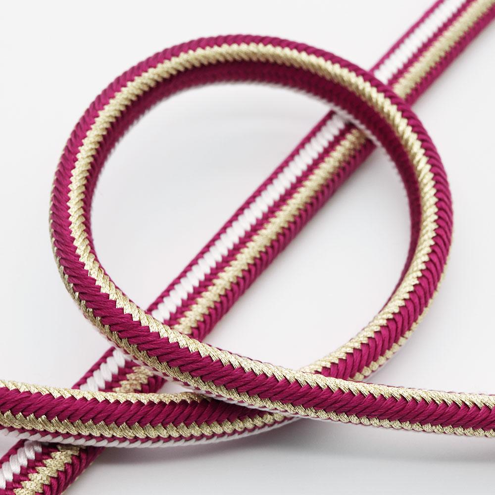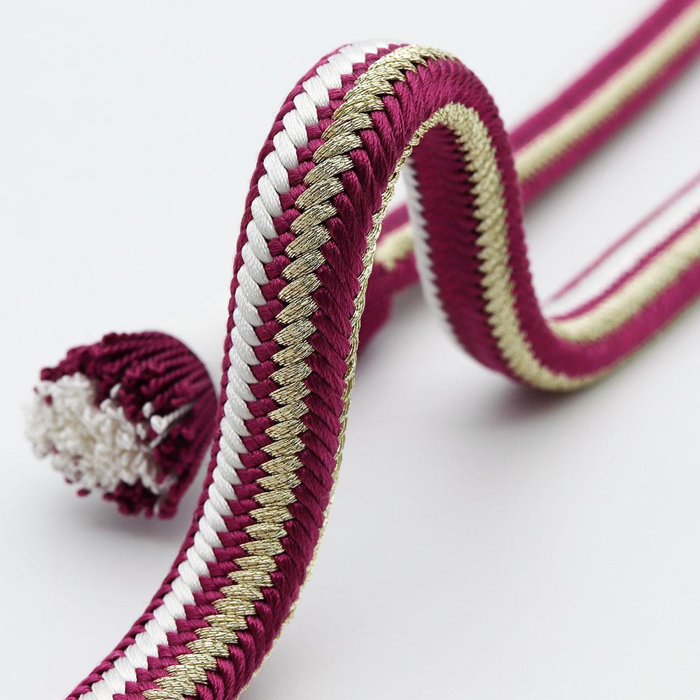 しっかりとした厚みを持ちながら、柔らかさとしなりを持った組上がりが特徴の御岳組みの一本です。3色に色分けして組み上げ、箔糸を組み込んだ上品なデザイン。平組みや、三分紐のような厚みでは単調になってしまいそうなコーディネートには、御岳組みの厚みと色数のあるデザインが華を添えてくれるでしょう。
