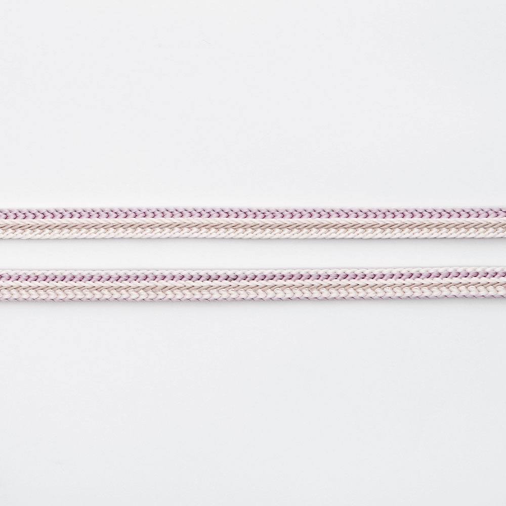畝打ち組の立体感と、源氏組みのしなやかさを持ち合わせた一本。薄藤を基調に三色使いで組み上げた、淡色のシンプルデザインになっています。