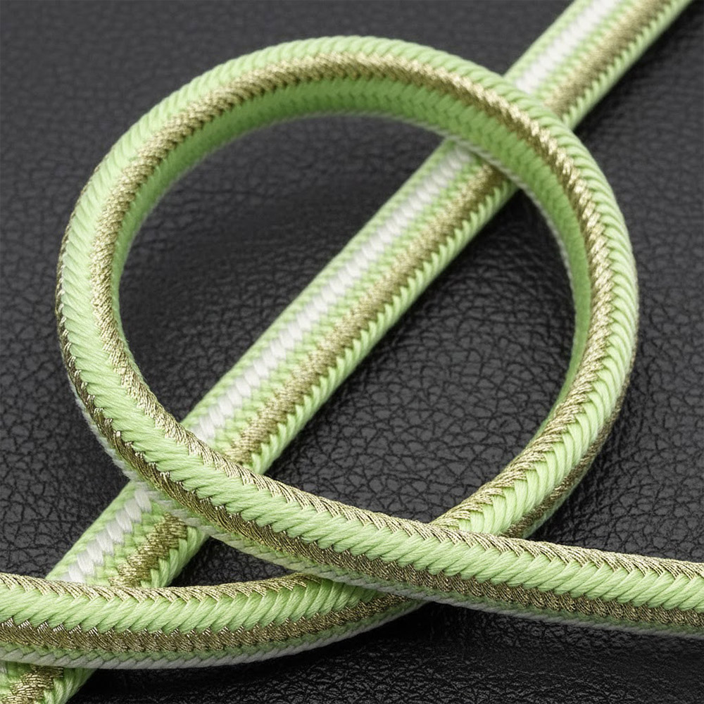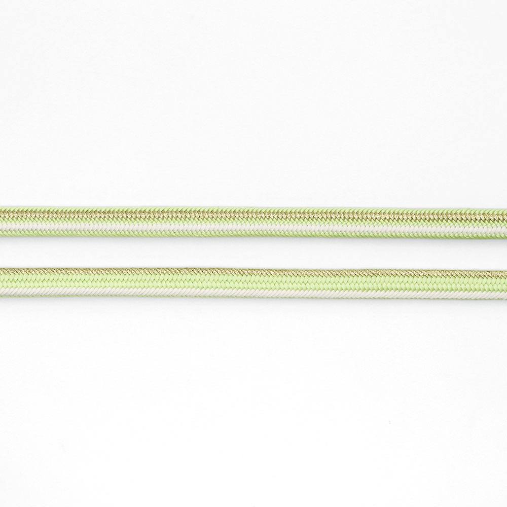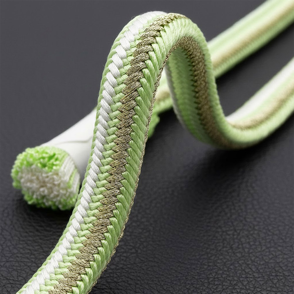 しっかりとした厚みを持ちながら、柔らかさとしなりを持った組上がりが特徴の御岳組みの一本です。3色に色分けして組み上げ、箔糸を組み込んだ上品なデザイン。平組みや、三分紐のような厚みでは単調になってしまいそうなコーディネートには、御岳組みの厚みと色数のあるデザインが華を添えてくれるでしょう。