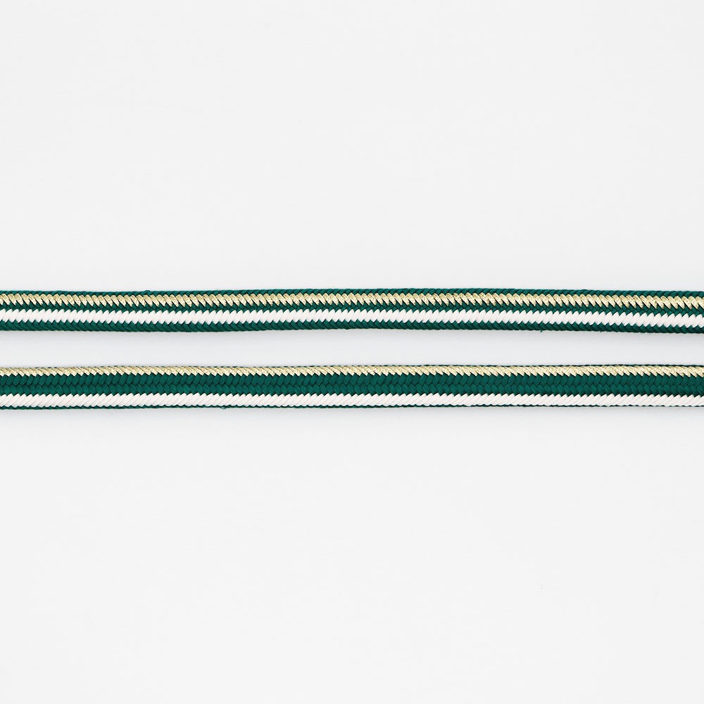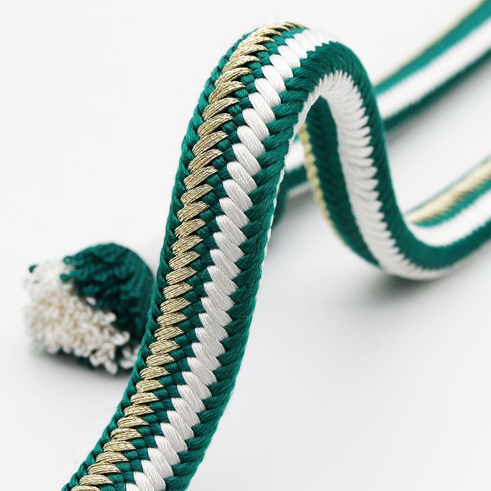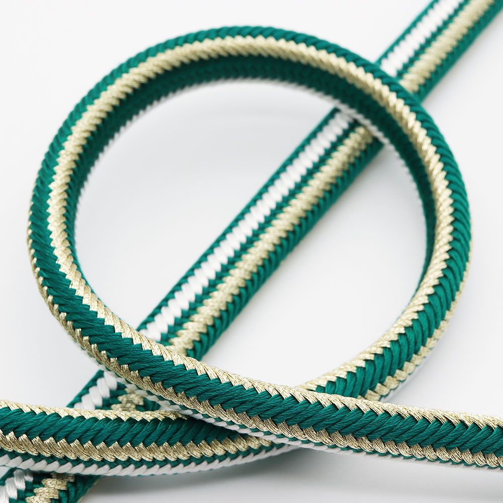 しっかりとした厚みを持ちながら、柔らかさとしなりを持った組上がりが特徴の御岳組みの一本です。3色に色分けして組み上げ、箔糸を組み込んだ上品なデザイン。平組みや、三分紐のような厚みでは単調になってしまいそうなコーディネートには、御岳組みの厚みと色数のあるデザインが華を添えてくれるでしょう。