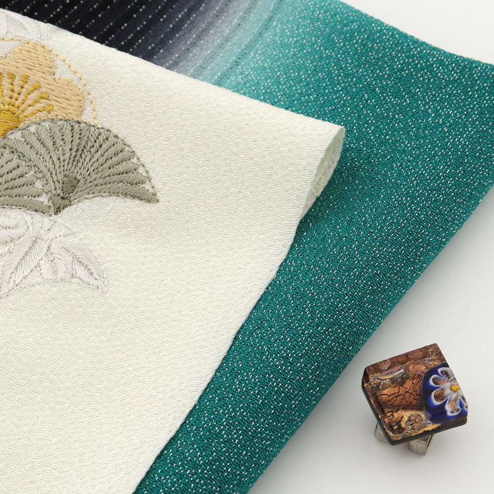 片側は細かいシボがふっくらとした質感を生み出す縮緬地、もう片側はほどよい透け感が涼しげな印象を与えてくれる縦絽生地。縦にそれぞれ異なる織を配し、季節やコーディネートによって幅広く使える一枚になっています。箔糸はどちらにも織り込まれ、華やかさはそのままに。黒×青緑のモダンなバイカラーが、カジュアルコーデのアクセントに活躍してくれそうです。