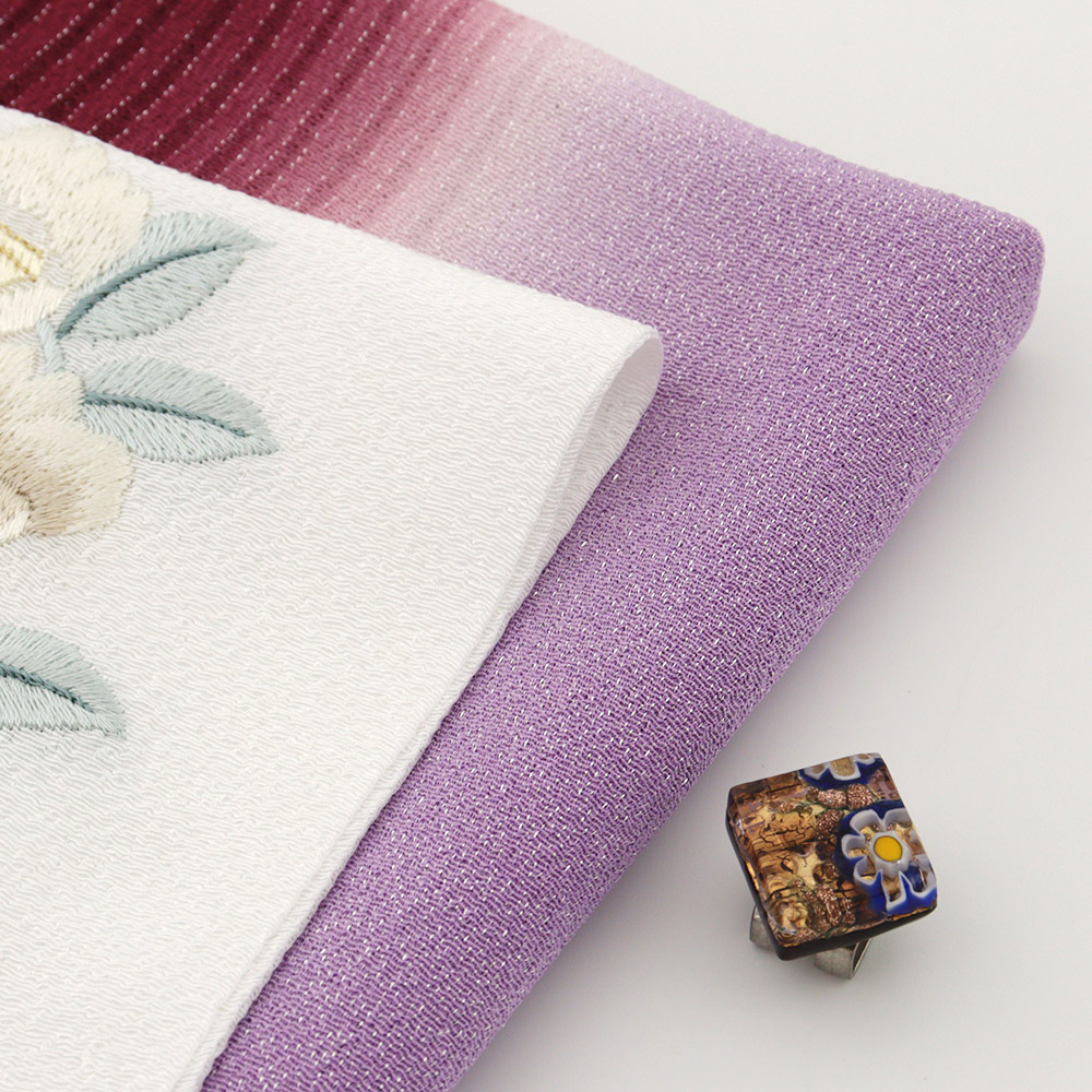 片側は細かいシボがふっくらとした質感を生み出す縮緬地、もう片側はほどよい透け感が涼しげな印象を与えてくれる縦絽生地。縦にそれぞれ異なる織を配し、季節やコーディネートによって幅広く使える一枚になっています。箔糸はどちらにも織り込まれ、華やかさはそのままに。赤紫×藤の上品なバイカラーが、カジュアルコーデのアクセントに活躍してくれそうです。