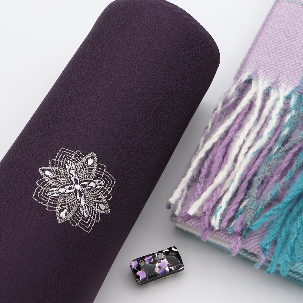 紫色の丹後ちりめん生地に美しい華紋の刺繍が施された飛び柄小紋。