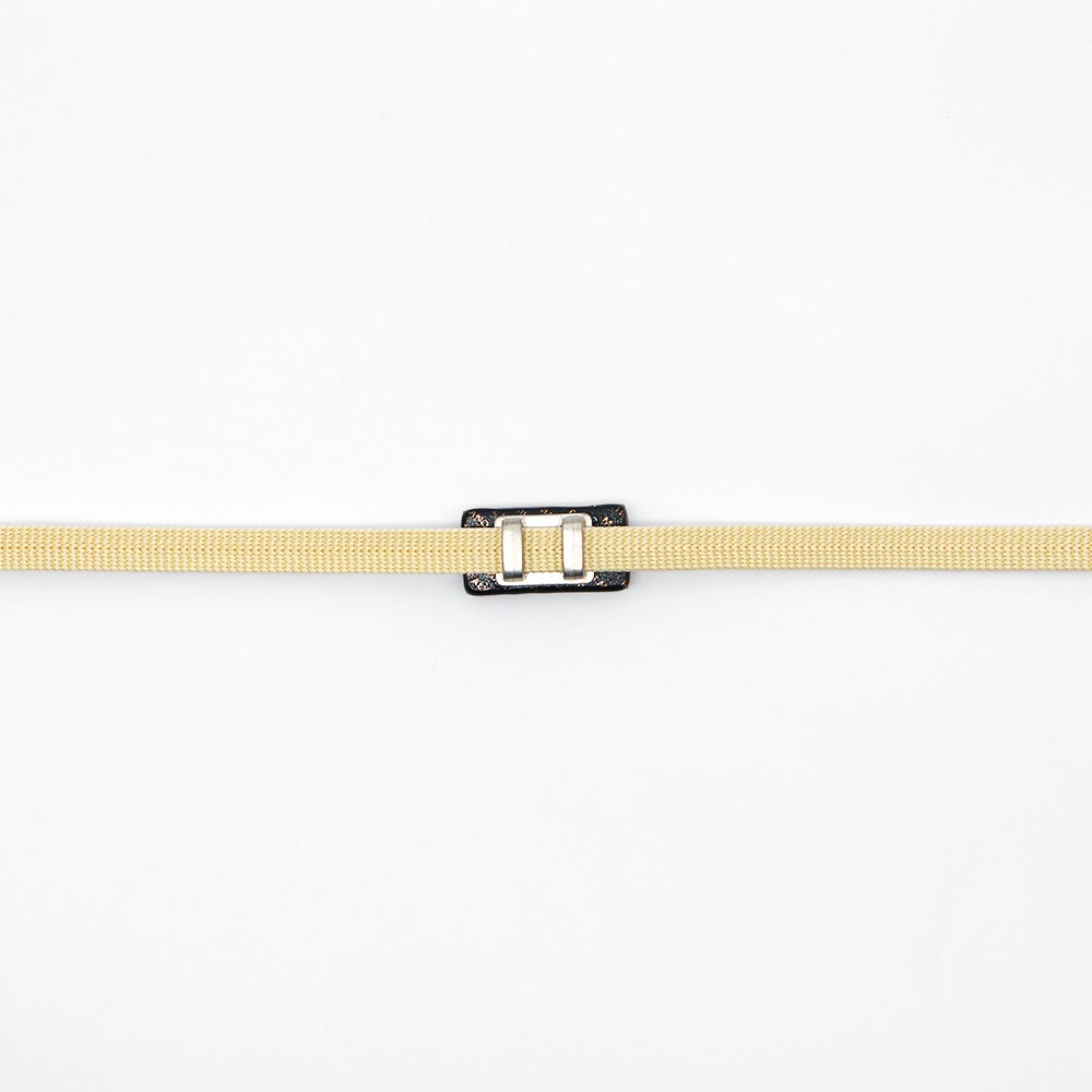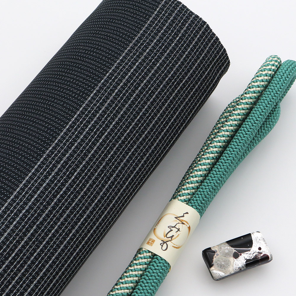 緑と生成色のバイカラーで、片側に斜模様を組み入れた一本です。丸唐組みのしなやかな質感と立体感が帯回りをほどよく華やかに。シンプルな帯に無地色では情緒に欠けてしまうようなコーディネートにおすすめです。