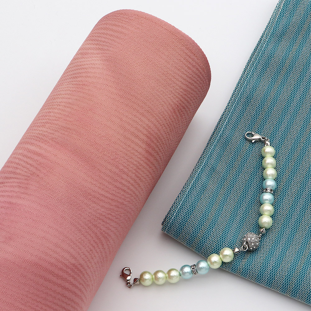 表にはストライプ柄のラメ入りレース生地、裏にはターコイズのシフォン生地をチョイスし、ボンディング加工を施した一枚です。