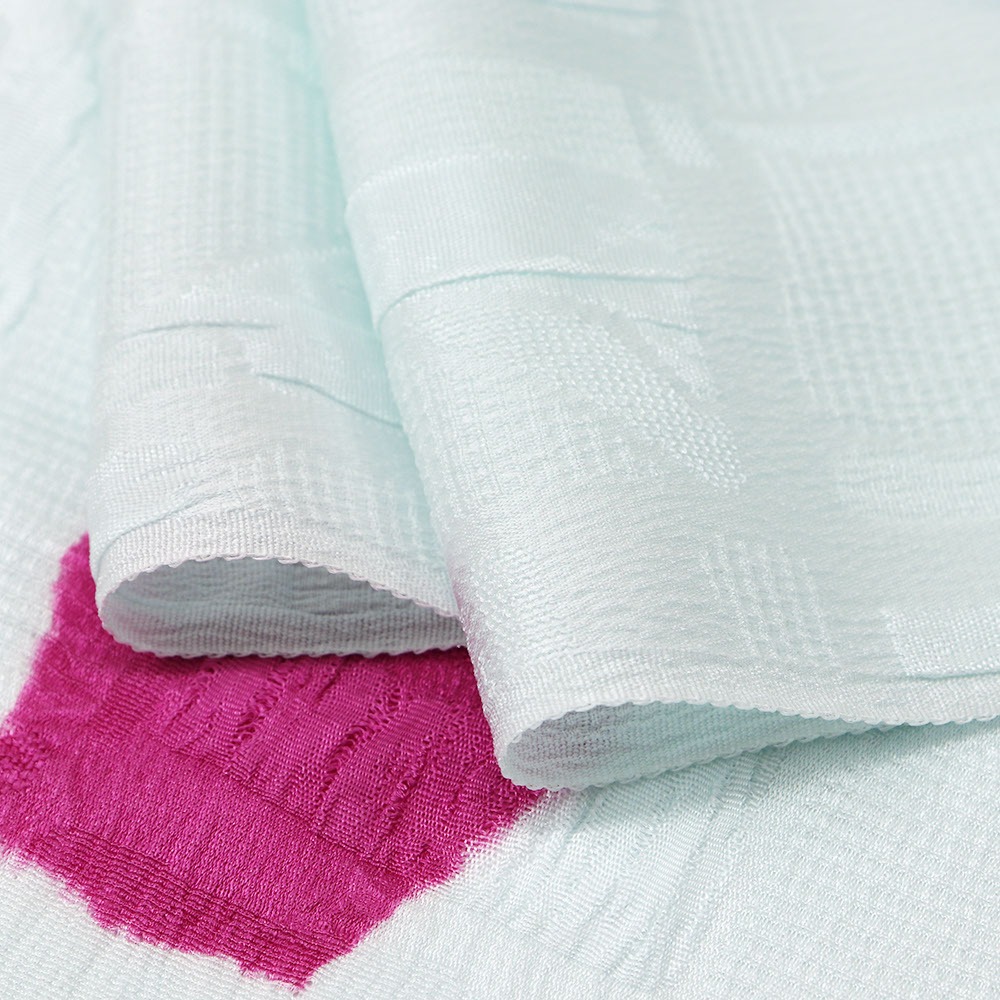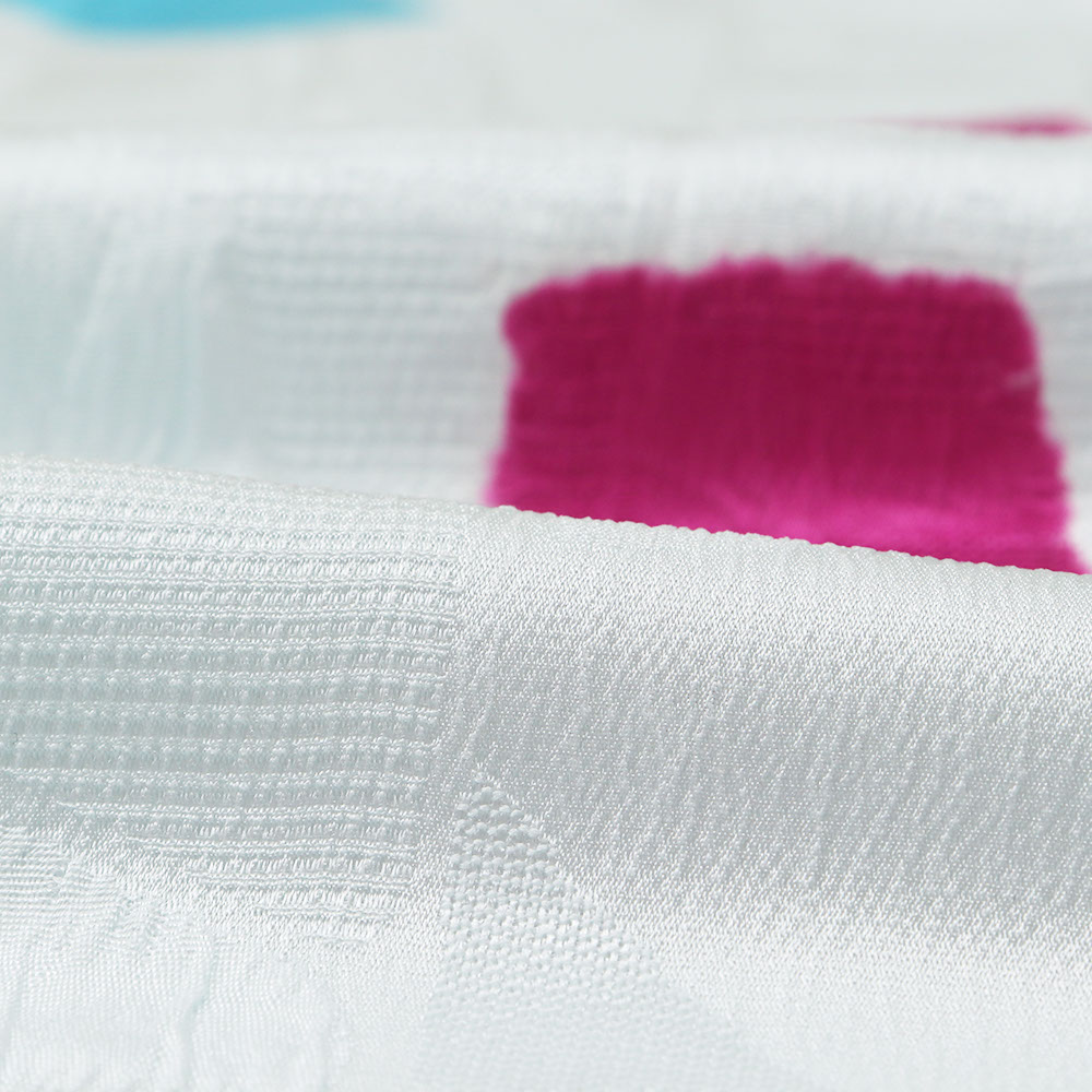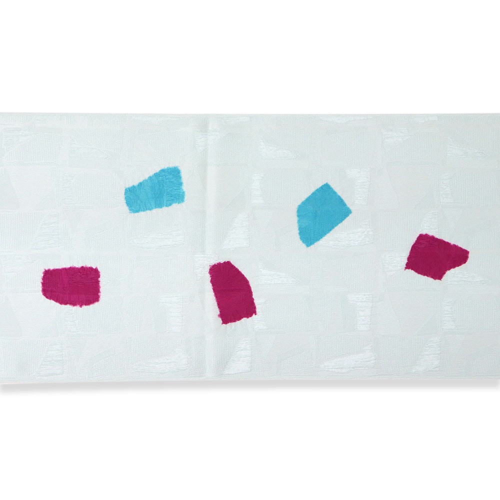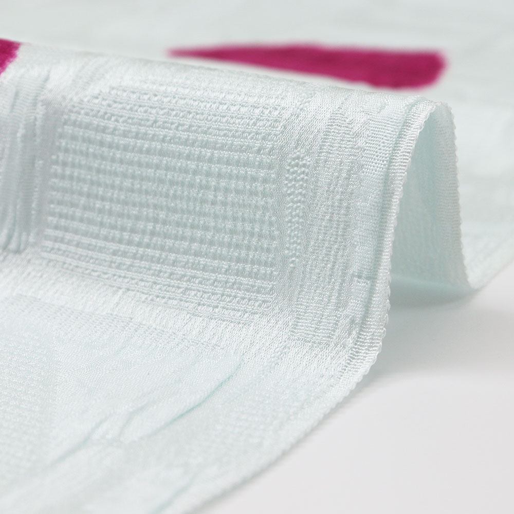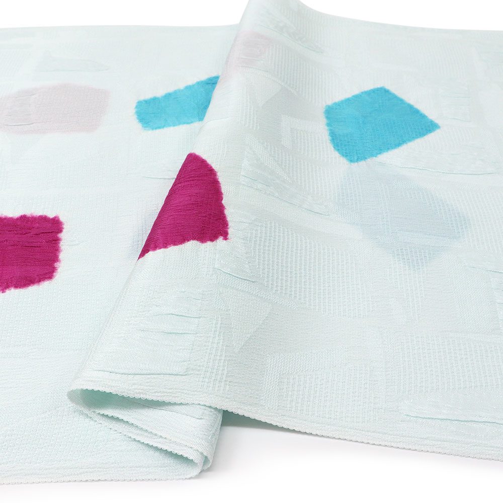 光沢感のある正絹地に、絞り染めを施した一枚です。大胆なスクエア模様とポップなカラーリングは帯元を明るく、そしてトレンディな印象に。