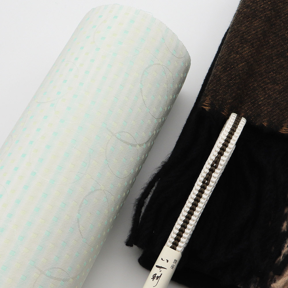 落ち着いた配色の角散らしに、大小様々な円相が織り出されたシンプルな御召です。