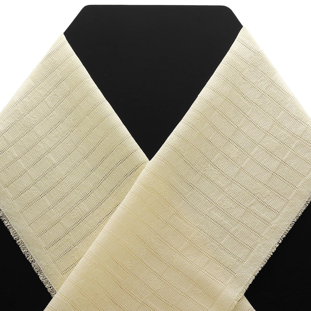 フワっと柔らかな軽さと、気持ちの良い肌触りが特徴の絽生地に、市松模様の地紋を織り出した一枚。その柄行きと付け心地で、サラッとした涼しさを首元から演出します。