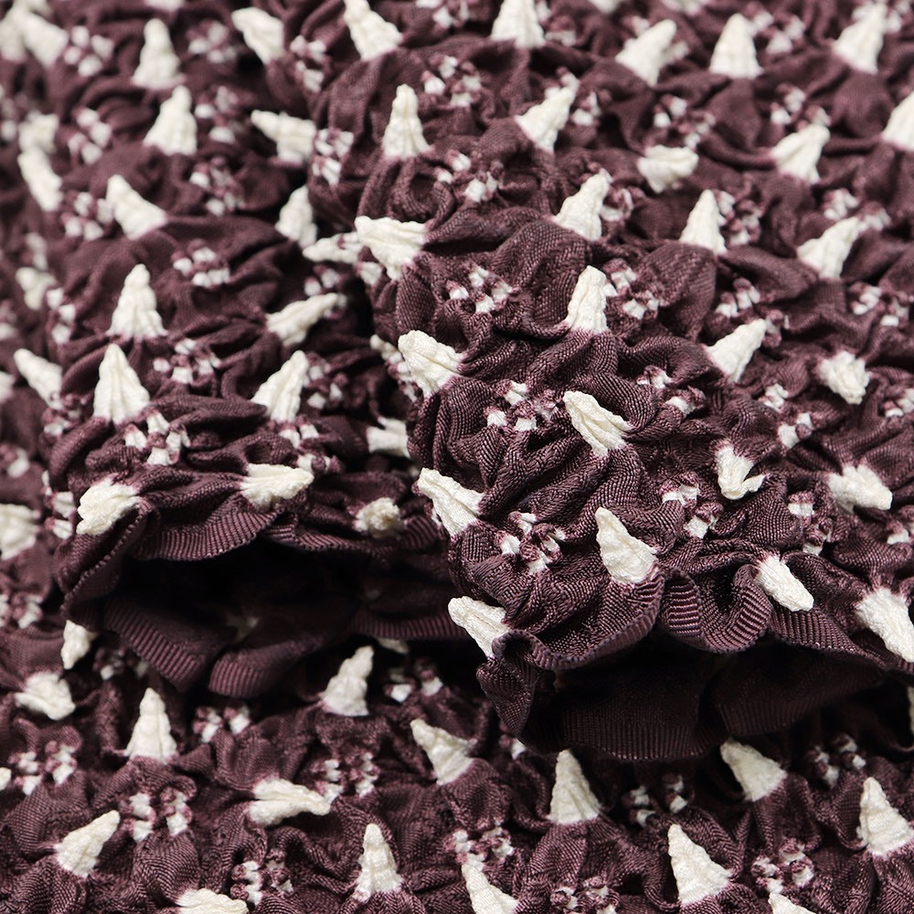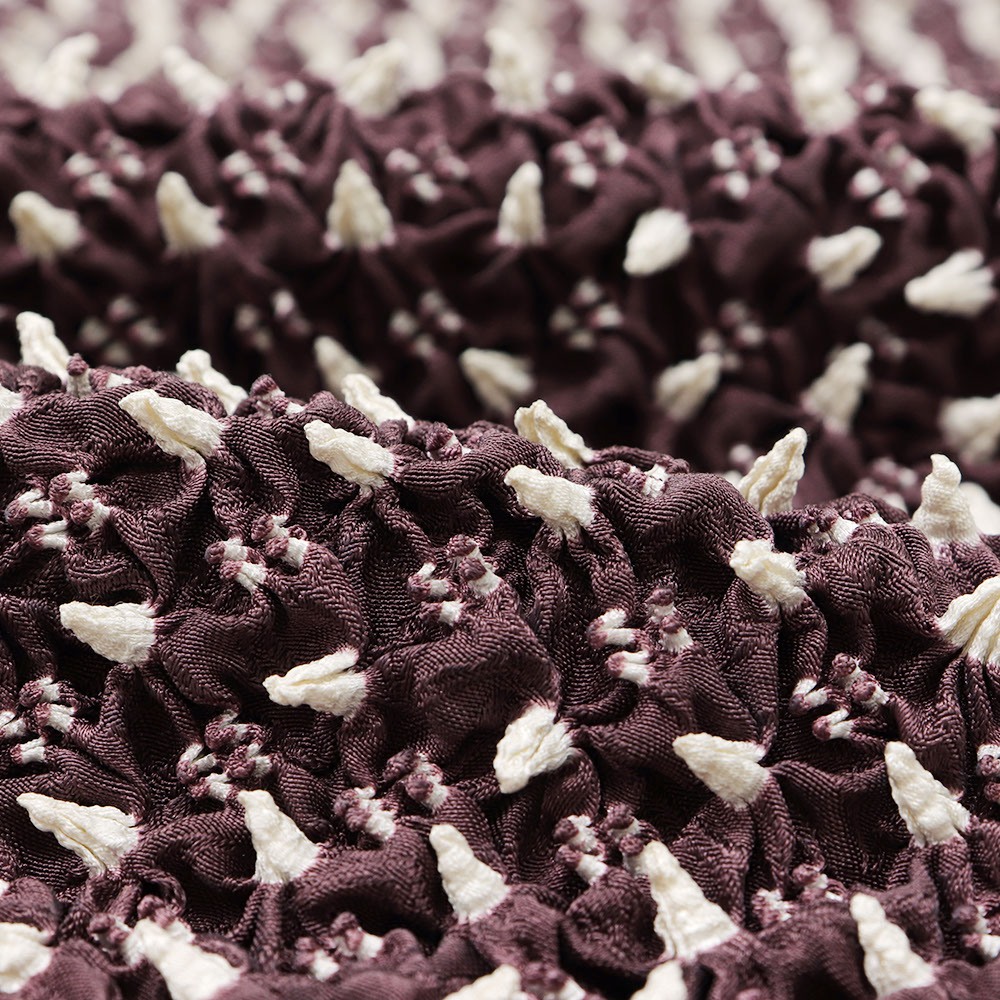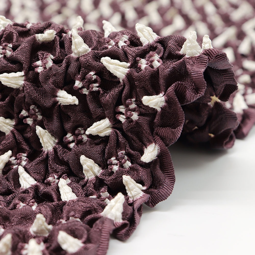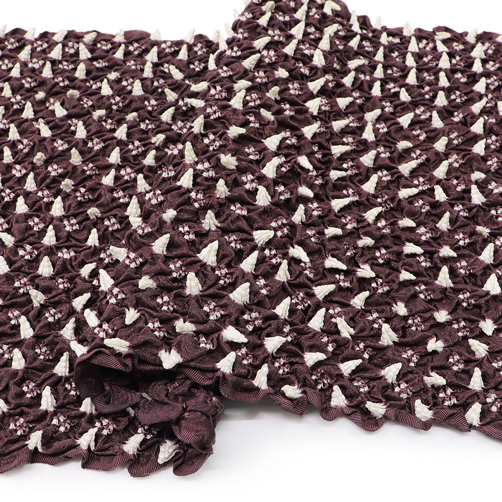 帯揚の端から端まで、すべてに絞りを施したボリュームのある一枚です。紫と白の色合わせは、彩度を抑えたオトナなカラーリング。絞りを取り入れてみたい、でも派手すぎるのは・・・という方にオススメです。