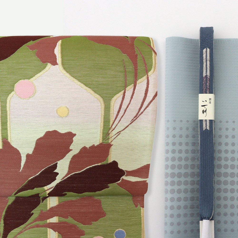 色合いを控えめにしながら、葉や水玉、立涌などを取り入れた面白味のあるデザインに仕上がりました。縁には金糸を使って煌びやかに遊び心を演出。賑やかな着物に合わせるもよし、控えめな着物に合わせて帯を主役に持ってくるもよし、個性的なコーディネートを楽しめそうです。帯遊びのコレクションにぜひ加えてお楽しみください。<通常価格:55000円>