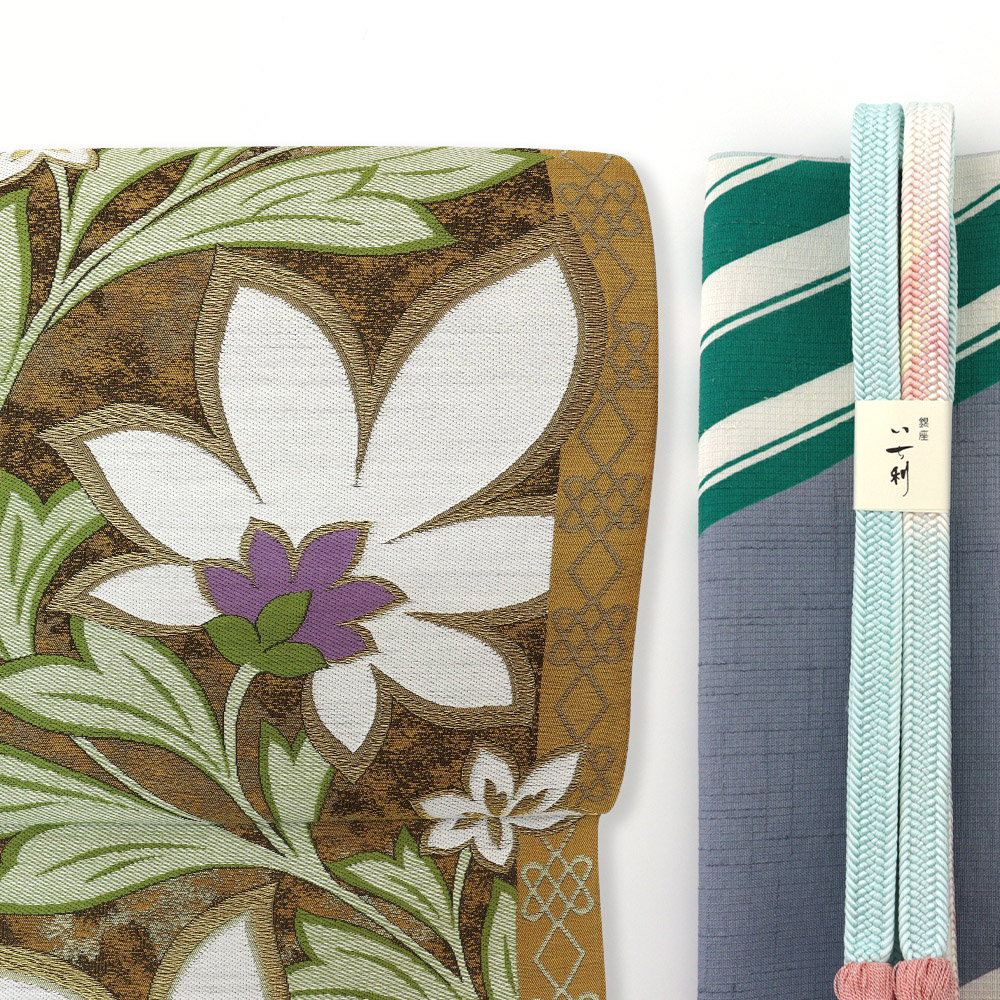 控えめな色合いで織り上げられた洋花の間道柄は、モダンさとシックな上品さを兼ね備えたデザインに仕上がりました。ところどころに織り込まれた金糸が煌びやかに遊び心を演出。賑やかな着物に合わせるもよし、控えめな着物に合わせて帯を主役に持ってくるもよし、個性的なコーディネートを楽しめそうです。帯遊びのコレクションにぜひ加えてお楽しみください。<通常価格:55000円>