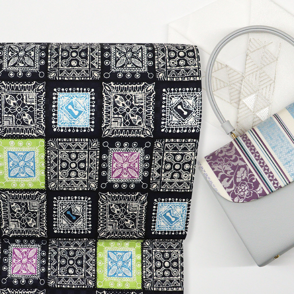 モダンな更紗間道を織りだした博多織帯地で、ぐっと洒落感が増した贅沢なひと品。