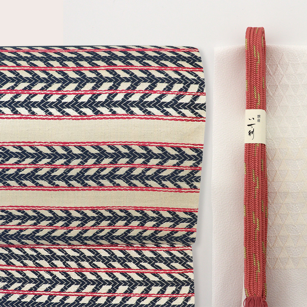 箔糸を織り交ぜた帯地に横段模様を織り上げたカジュアルでモダンな意匠。西陣織ではあまり見かけない大胆な構図が、コーディネートにしっくりと溶け込んで着姿を引き立てます。