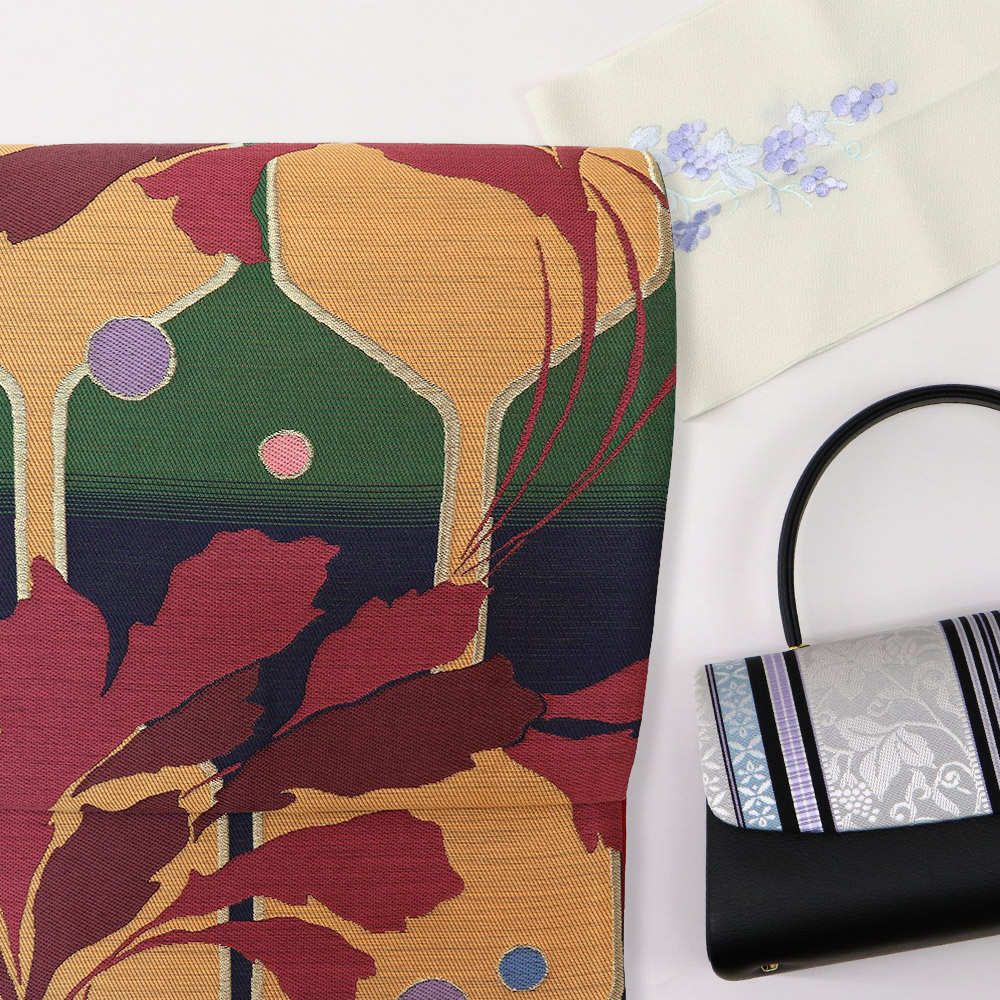 色合いを控えめにしながら、葉や水玉、立涌などを取り入れた面白味のあるデザインに仕上がりました。縁には金糸を使って煌びやかに遊び心を演出。賑やかな着物に合わせるもよし、控えめな着物に合わせて帯を主役に持ってくるもよし、個性的なコーディネートを楽しめそうです。帯遊びのコレクションにぜひ加えてお楽しみください。<通常価格:55000円>