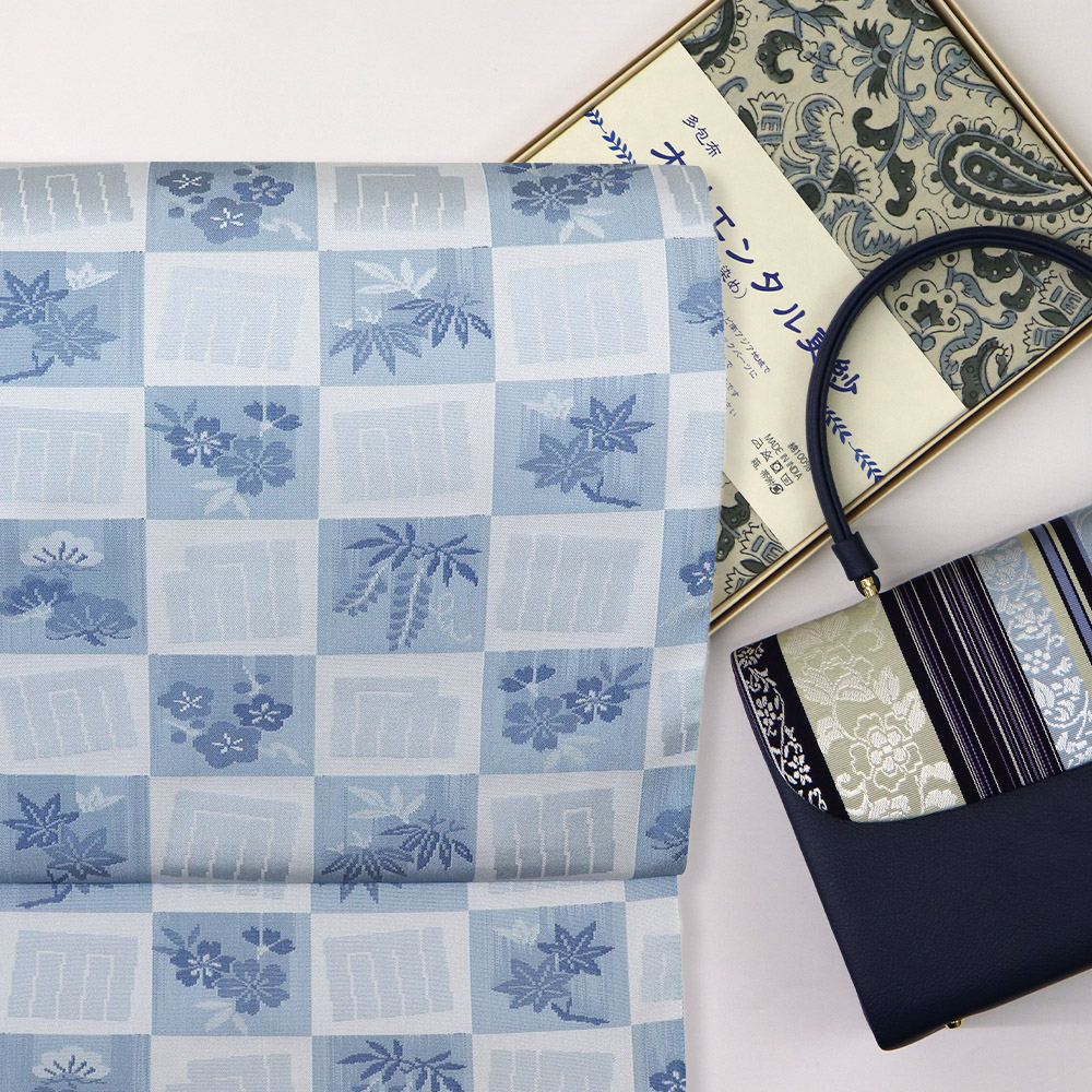 ソフトな色彩の古典的な柄行きは、小紋や色無地、無地場の多い織の着物まで着姿をしっかりと整えてくれるでしょう。西陣の名門が造り出す経錦をコーディネートに活躍させてみてはいかがでしょうか。<通常価格:55000円>