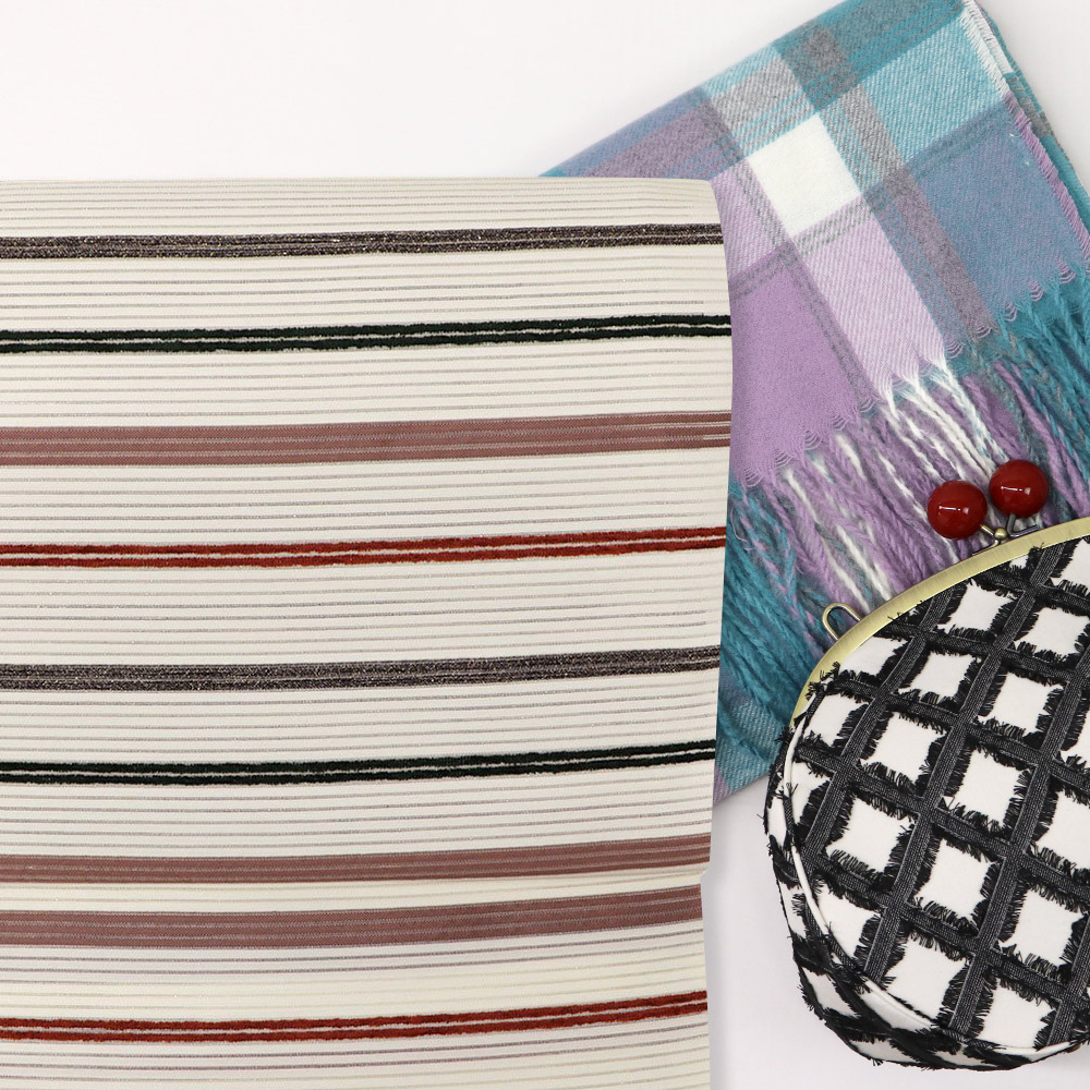 縞が連なるシンプルな柄行きですが、ふわふわのモール糸や、全体に散りばめた銀糸が顔を出す、味わいのある仕上がりに。