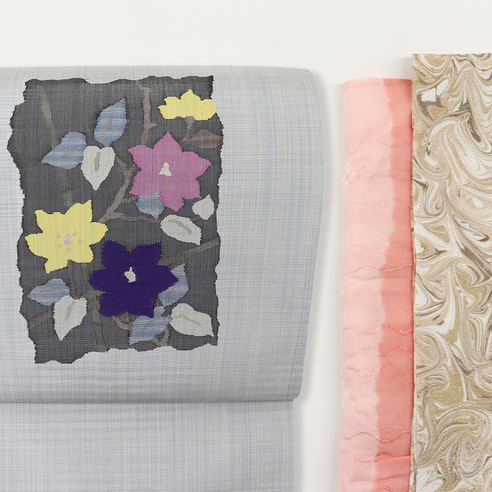 無地系着物には織り柄が映えて主役級に、総柄などの個性派着物にはほどよくバランスを取ってくれそうです。
