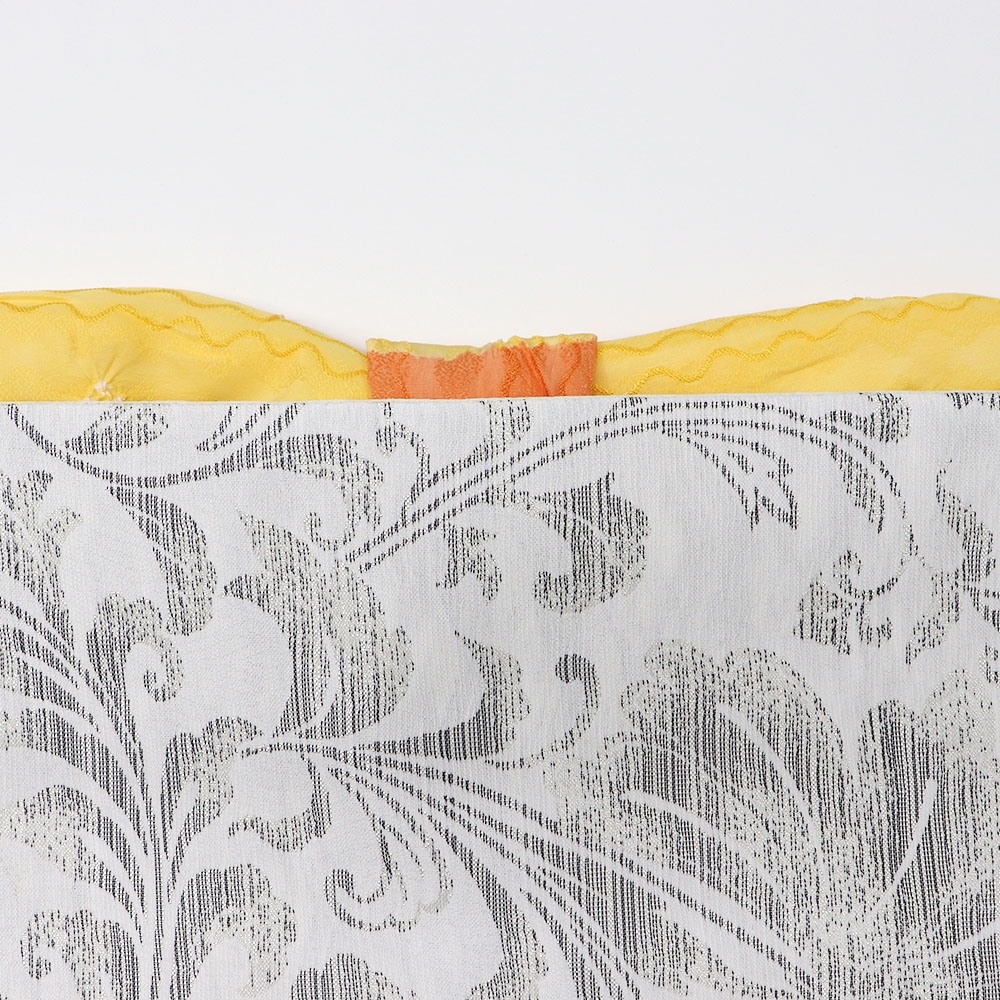正絹地によろけ地紋を織り出し、その上から絞り染めを施した一枚です。鮮やかなカラーリングと特徴的な縞模様が、パッと目を引くアクセントに。帯の上からチラリと覗かせ、ワンポイント感覚でお楽しみいただけます。