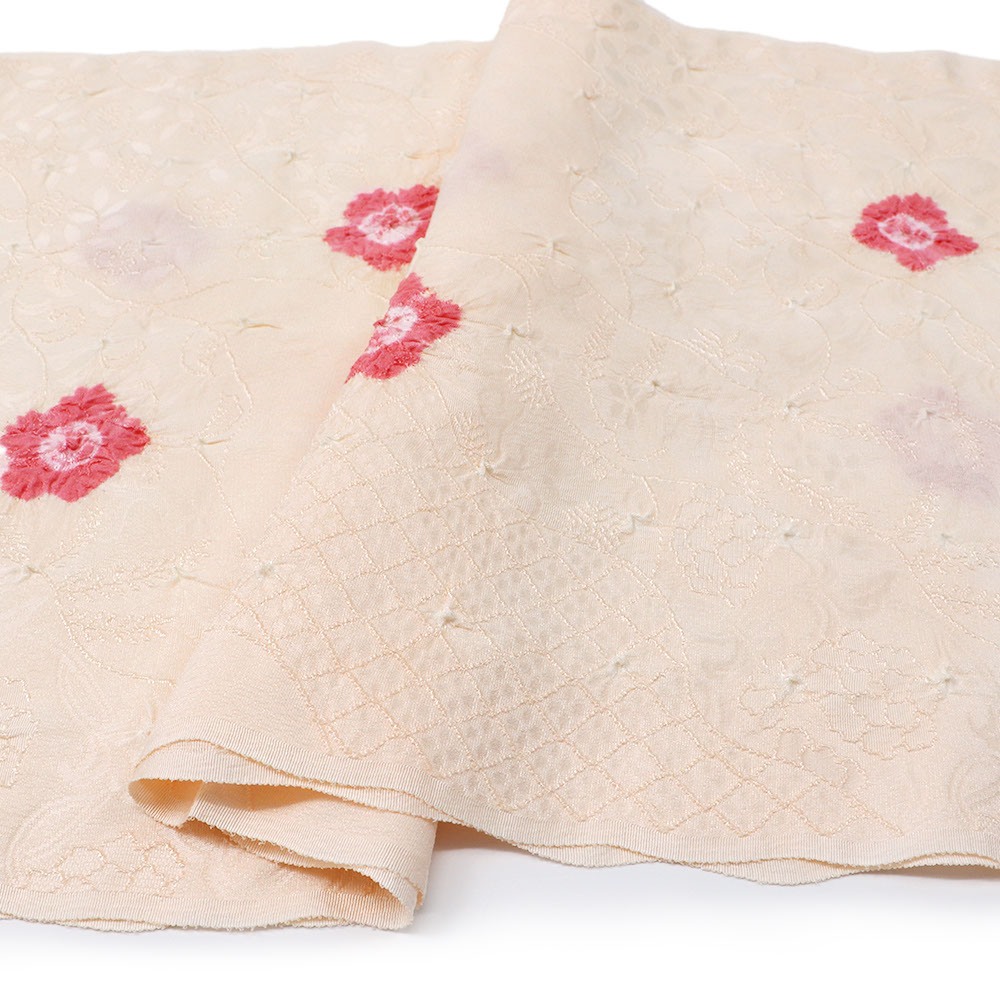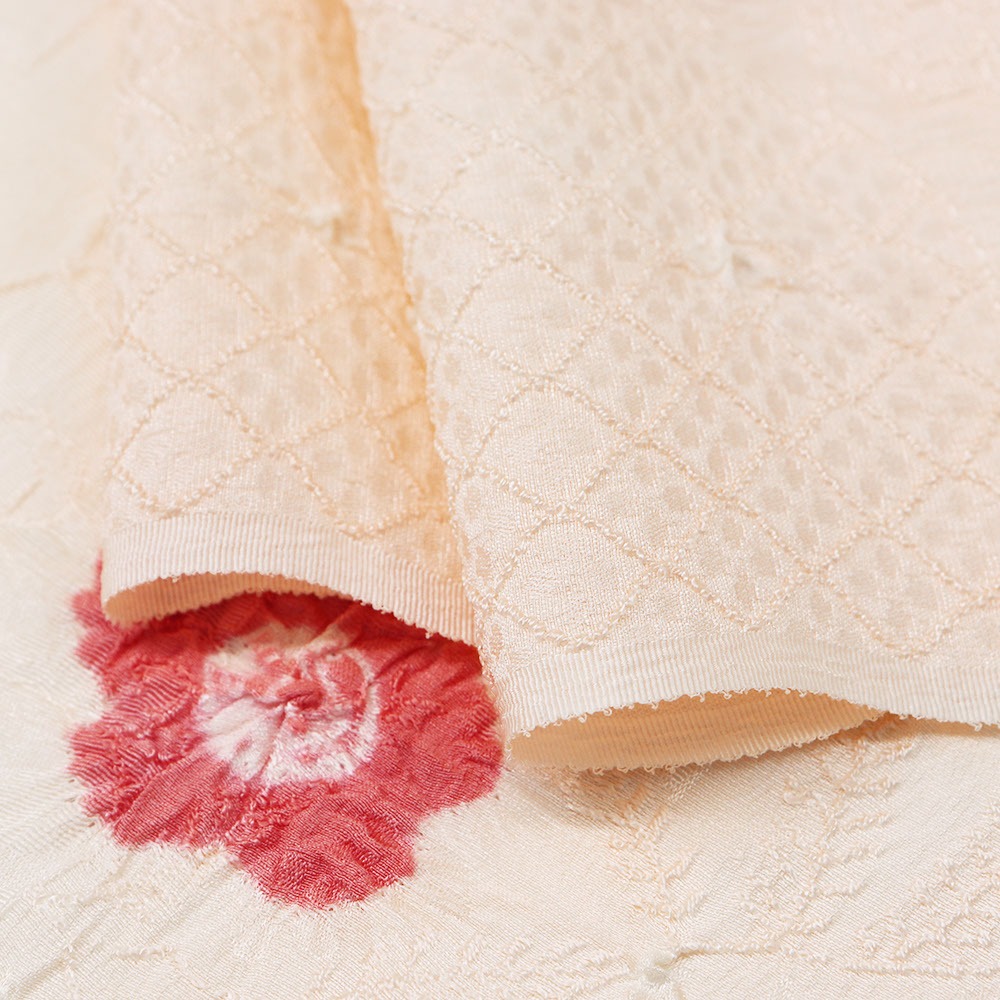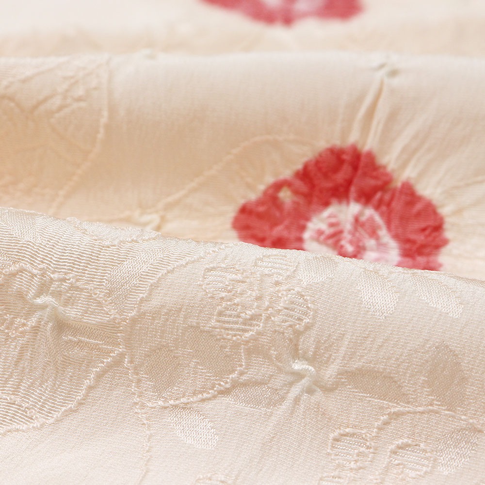 正絹地に道長取り地紋を織り出し、小花の飛び絞りを施した一枚。小さな絞りが細やかな陰影を生み出し、繊細で上品な仕上がりになっています。
