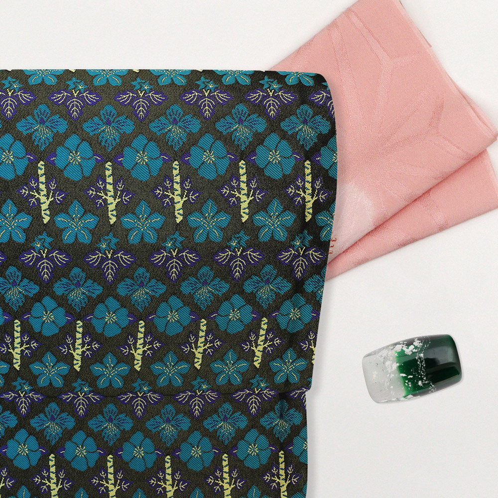 様々な草花紋を規則正しく織り出した意匠は、伝統の中にモダンさをプラスした名門の成せる業。選び抜かれた色使いは、上品で洗練された雰囲気を醸し出し、長年培われてきた美的感覚ならではの風情があります。