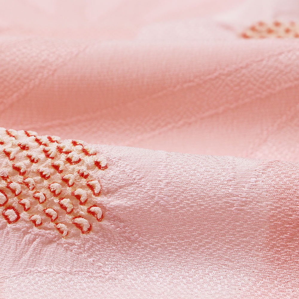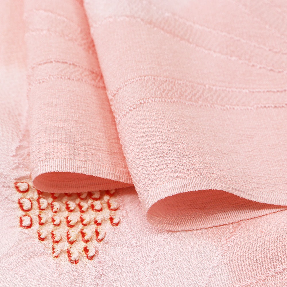 正絹のちりめん地に麻の葉地紋を織り出し、その上から絞り染めを施した一枚。細やかな梅模様がふんわりとした優しい陰影を生み出しています。