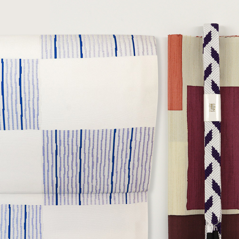 淡色の帯地に縞市松模様が織り上げられたモダンな一本。帯地、柄行きともに絹艶が美しく、動くたびに光を浴びて陰影がゆらめき奥行を感じさせます。意匠と織り味にこだわりぬいた山田織物ならではの仕上がりです。それでいて軽い地風に控えめな色彩のため、一本持っておけば幅広いコーディネート活躍するのも嬉しいところ。