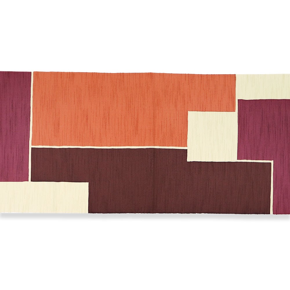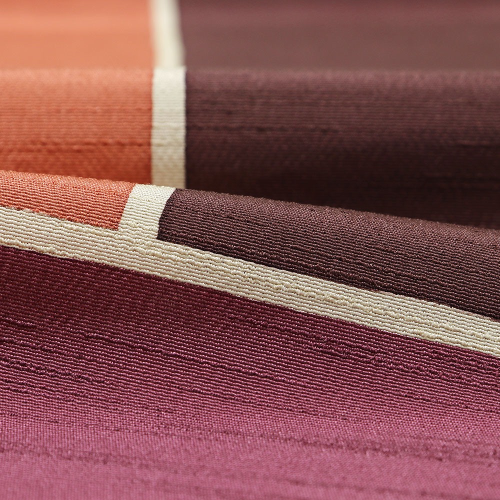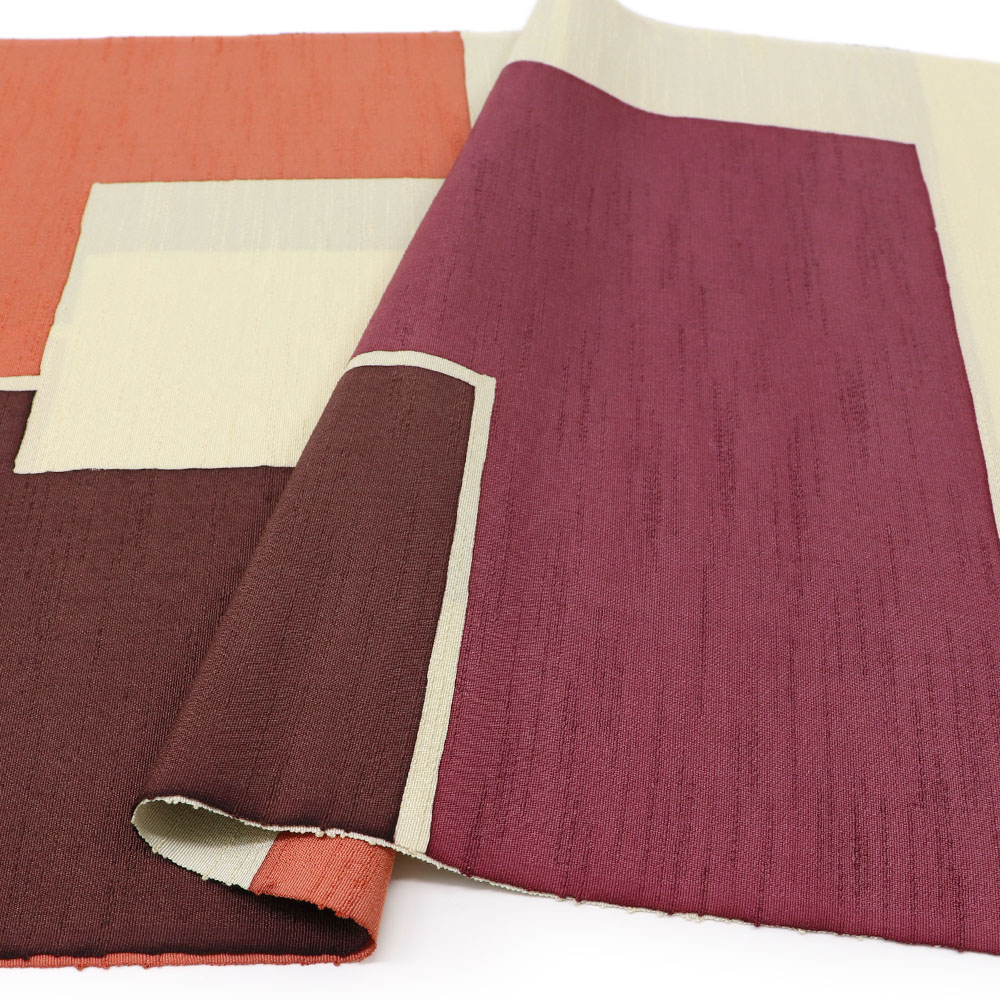 薄黄、紫、茶で幾何模様を染めた一枚。シャープな輪郭線や鮮やかな発色が、帯元をモダンに演出してくれるでしょう。