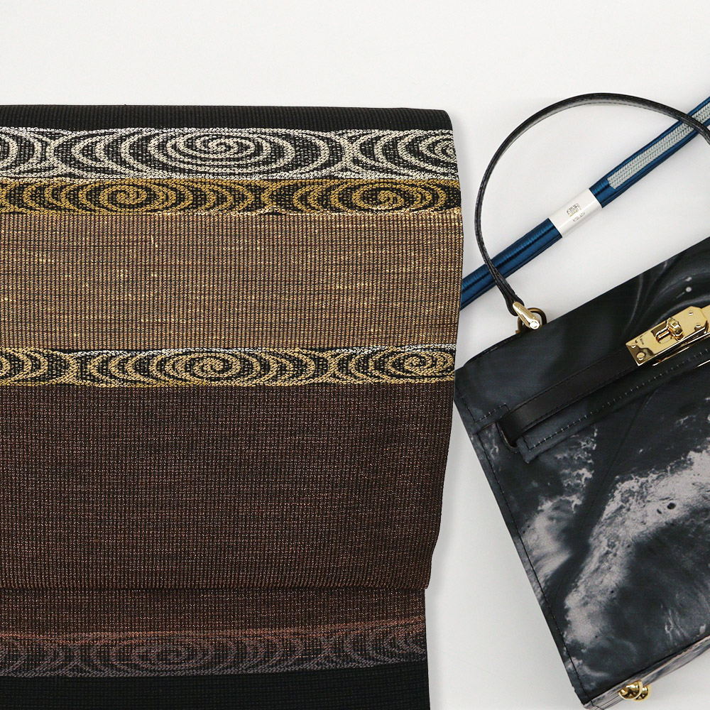 金糸を帯地に織り込んだ紋紗の軽い帯地に、観世水などの横段模様を配した柄行き。シンプルながらも、金銀糸や帯地裏から見え隠れする金糸のあしらいが味わい深さを感じさせるところは、さすが【河瀬満織物】といえるでしょう。お太鼓が二重のように見えるのでカジュアルだけでなく、お出かけやセミフォーマルの場にも合わせられます。シンプルなコーディネートか華やかなコーデまで、ぜひ幅広くご活用ください。<通常価格:198000円>