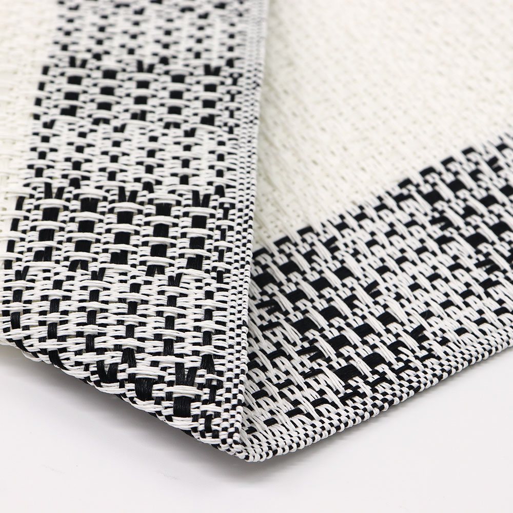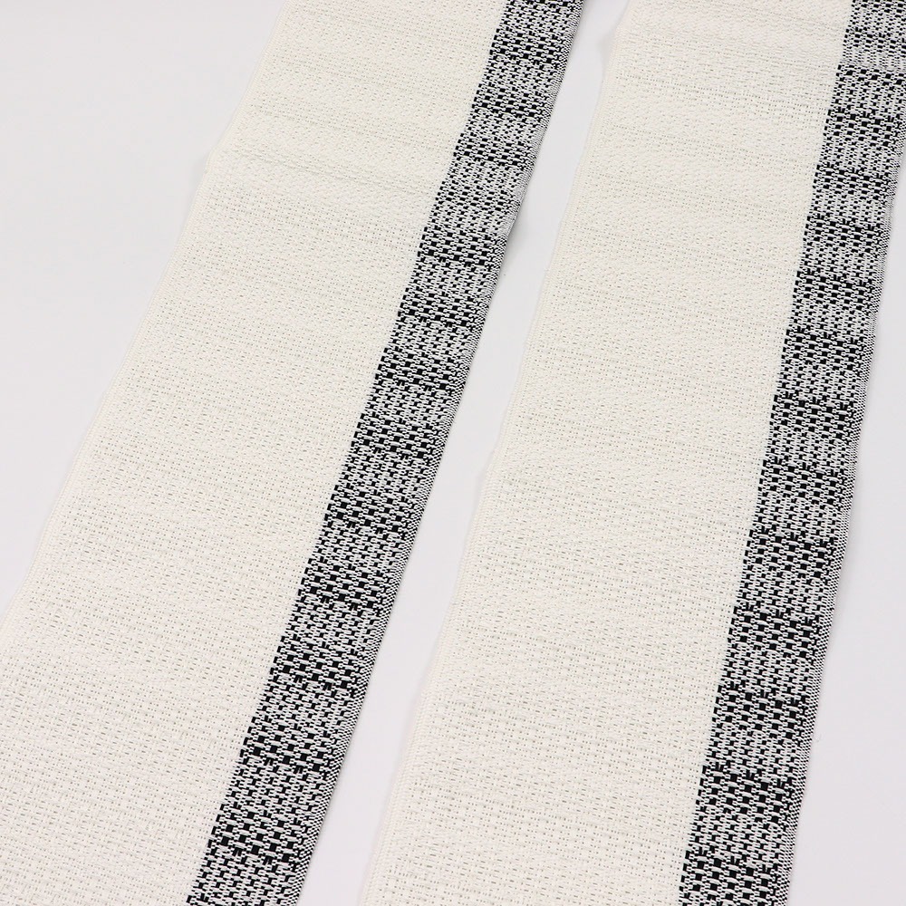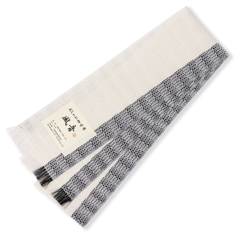 博多織や西陣織の半幅帯とは一味違う、麻のざっくりとした風合いが民芸的で温かみのある一本。端で色を切り替えたモノトーンのシンプルデザインが、シャープで都会的な仕上がりです。