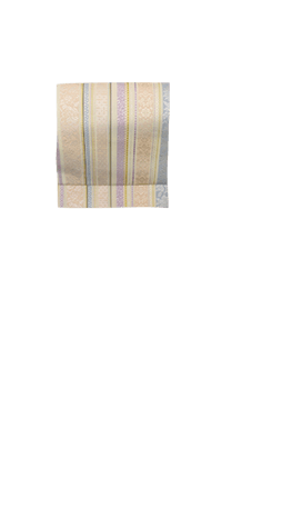 クリーム色の帯地に、パステル調の更紗模様の間道が織り上げられた、上品さと可愛さを兼ね備えた現代的な柄行きに仕上がっています。